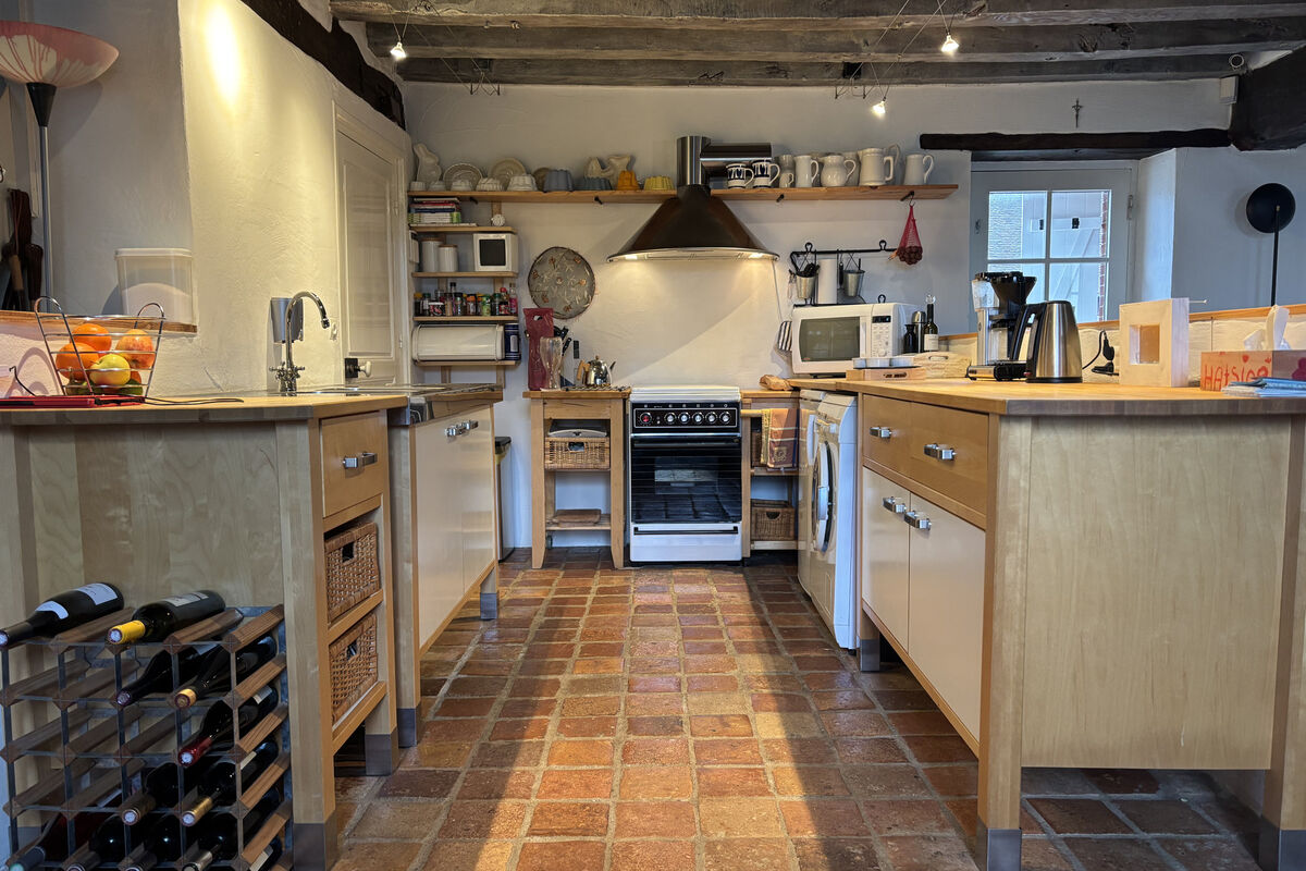 U komt binnen via een originele en karaktervolle voordeur in de open en ruime leefruimte. Hier vallen direct het balkenplafond en de combinatie van een eiken houten en originele tometten vloeren op. De leefruimte is ingedeeld in een gezellige zithoek met houtkachel en een deur naar de achterzijde van de woning, een open keuken voorzien van een los gasfornuis met oven en aansluiting voor een wasmachine.