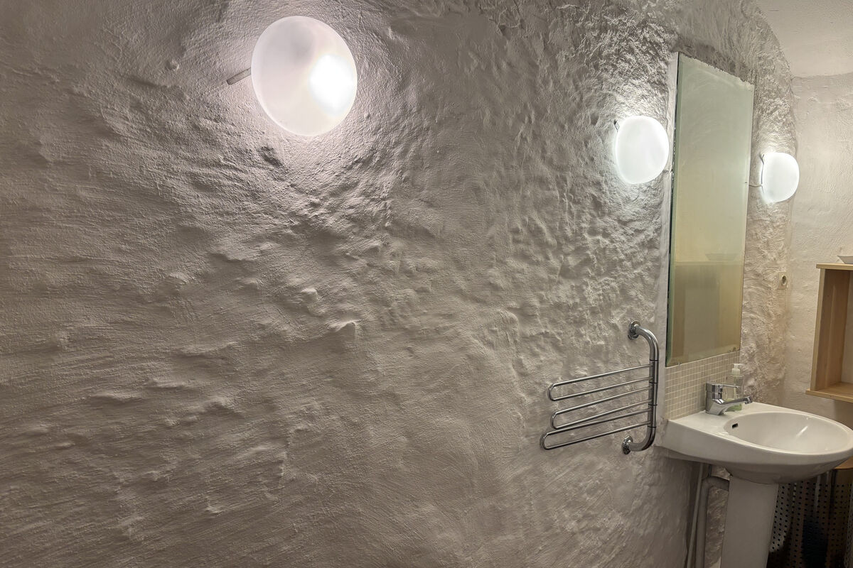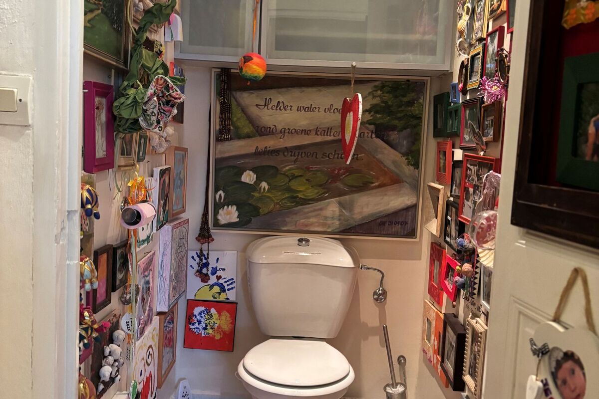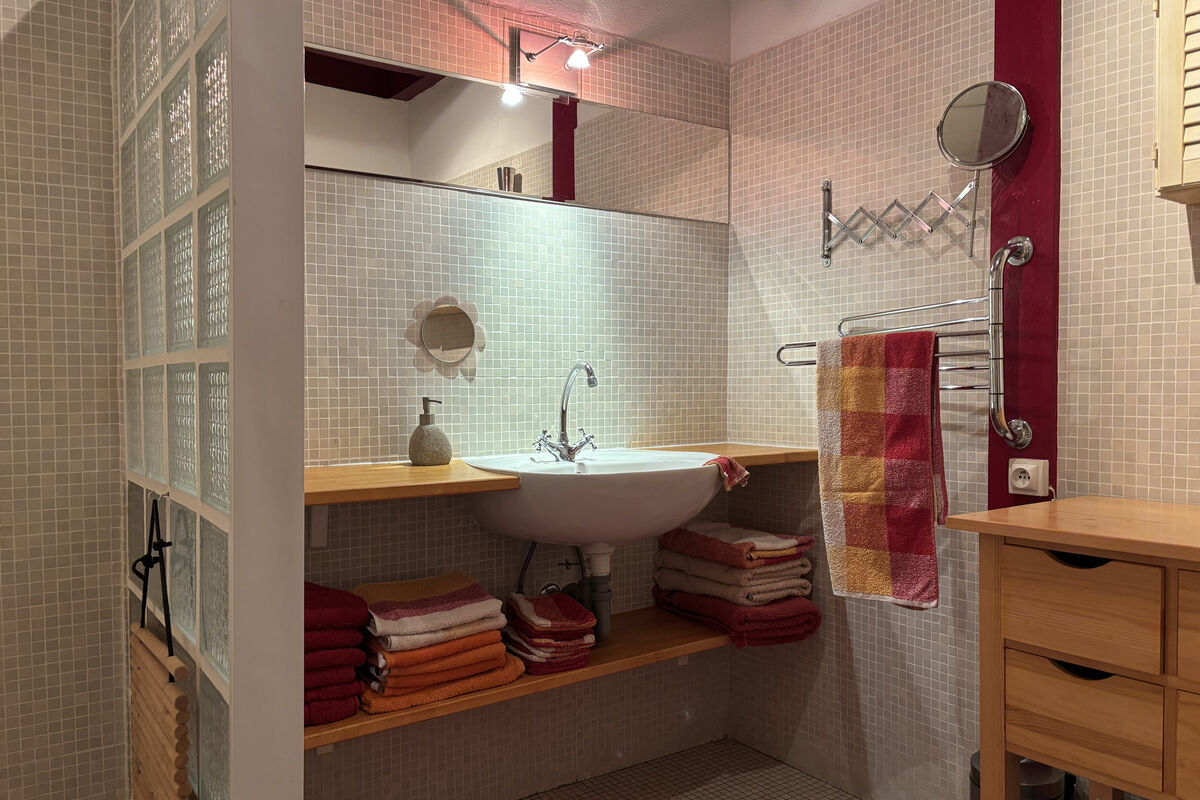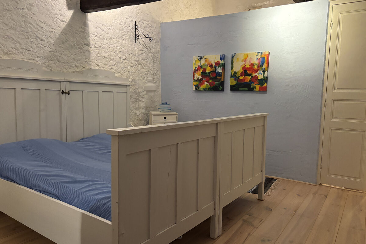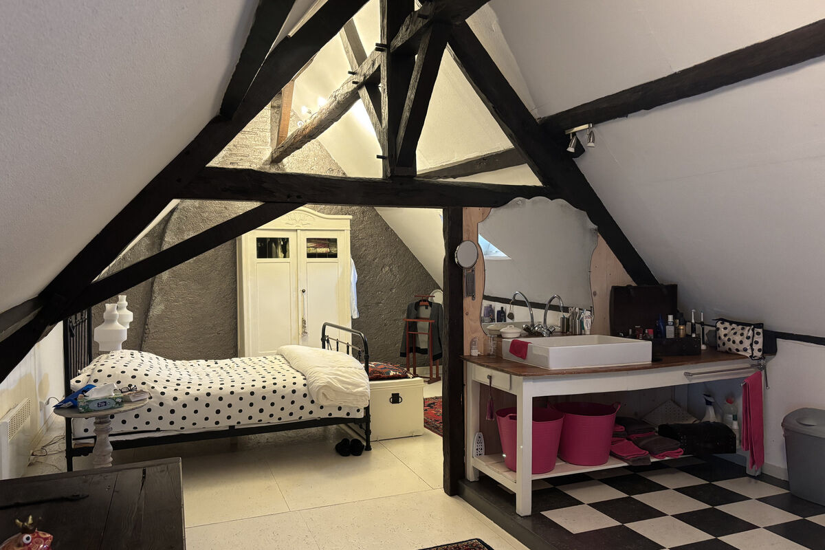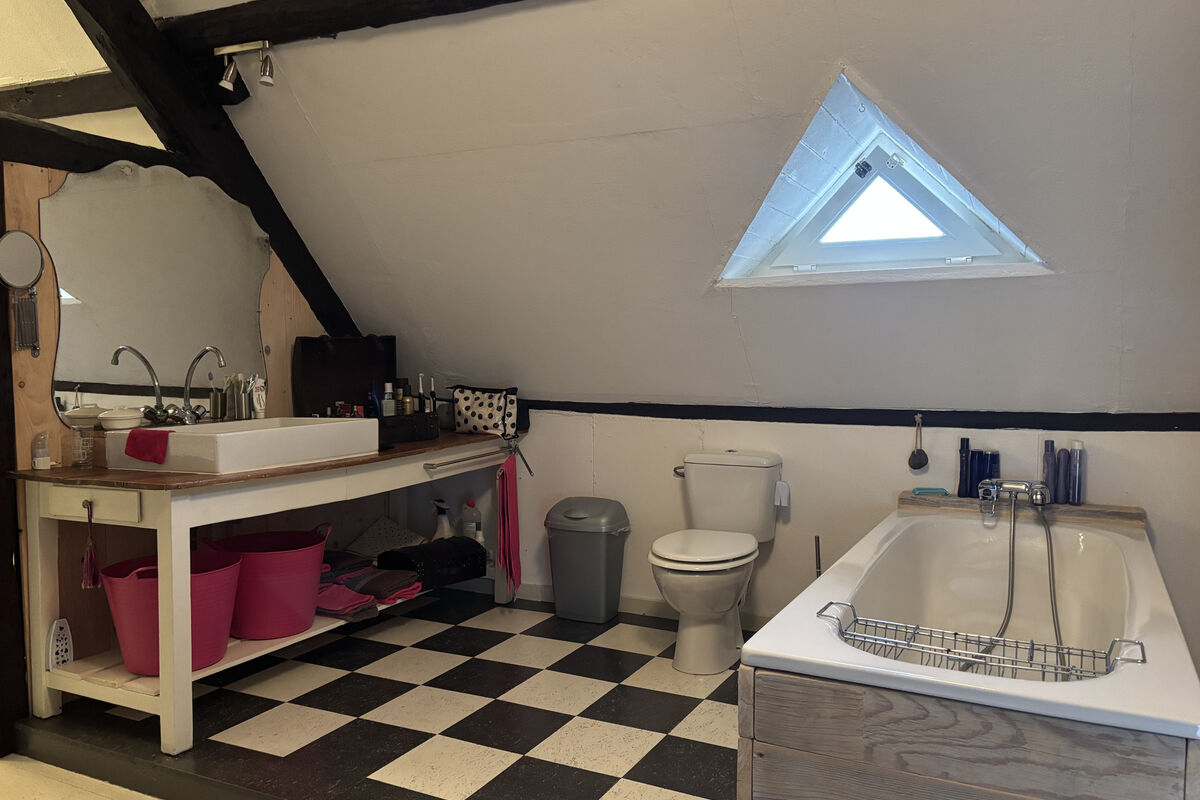 Vanuit de eetruimte bereikt u een hal met een apart toilet, een badkamer met wastafel, douche en afzuigsysteem, en twee slaapkamers. De eerste slaapkamer heeft een openhaard en een deur naar de voorzijde van de woning. De tweede slaapkamer, bereikbaar via een klein niveauverschil, beschikt over een eigen badkamer met wastafel, toilet, ruime inloopdouche en authentieke tometten vloer en heeft een deur naar de achtertuin.