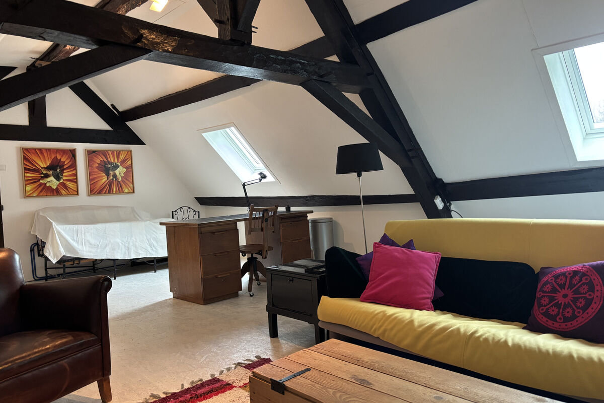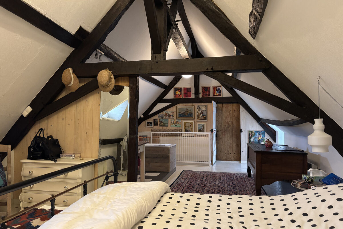 Via de trap in de eetruimte komt u op de bovenverdieping, waar zich een ruime derde open slaapkamer bevindt met een open badkamer voorzien van ligbad, toilet en wastafel, deze ruimte kun je door het plaatsen van een muur afgesloten maken. Links van de trap ligt een vierde kamer, momenteel ingericht als tweede woonkamer en kantoor.
