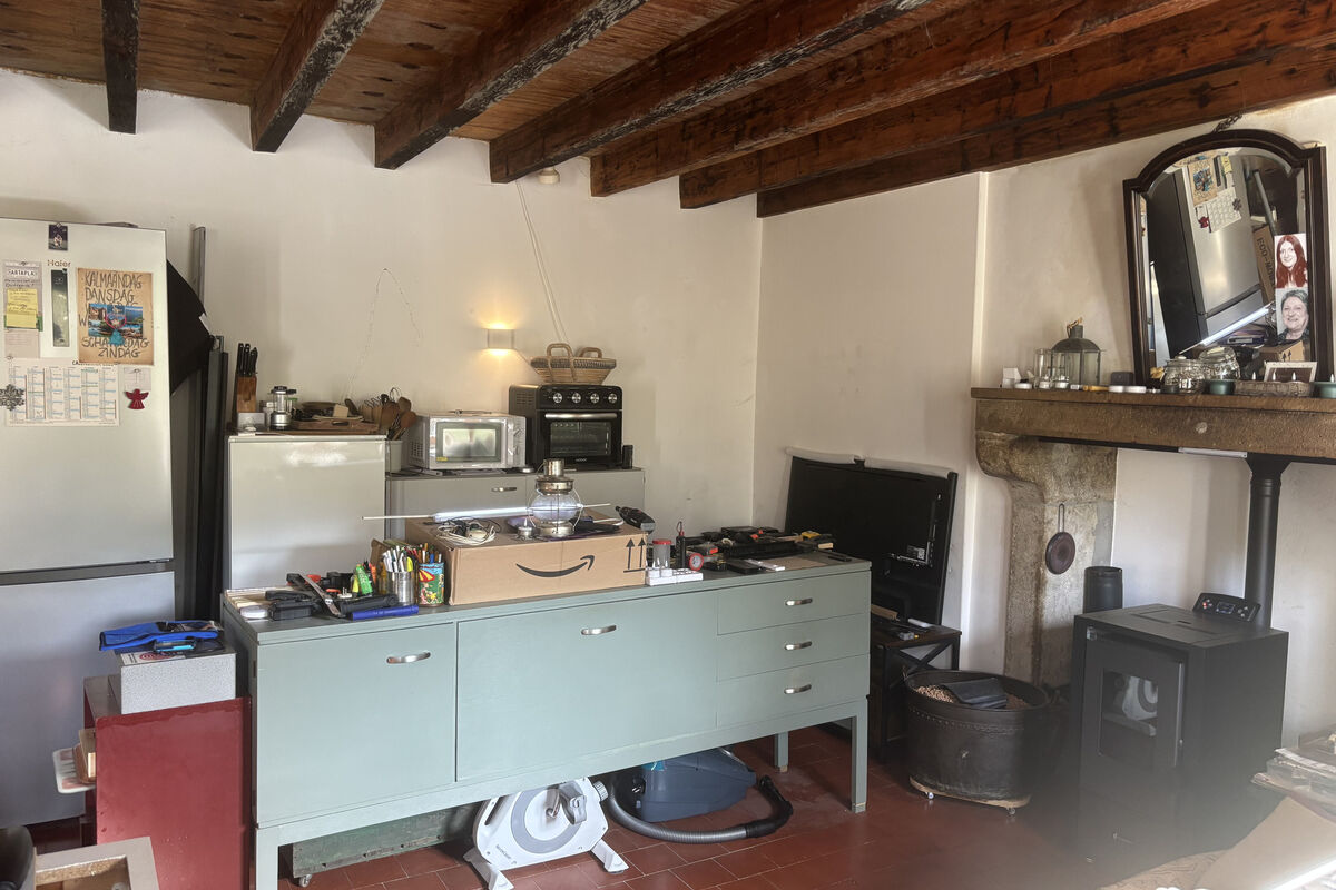 U komt binnen in de leefruimte, verdeeld in zit-, eet- en keukengedeelte. Er ligt een authentieke tometten vloer, de balken aan het plafond zijn zichtbaar gebleven en er wordt in de zithoek verwarmd met een pelletkachel.