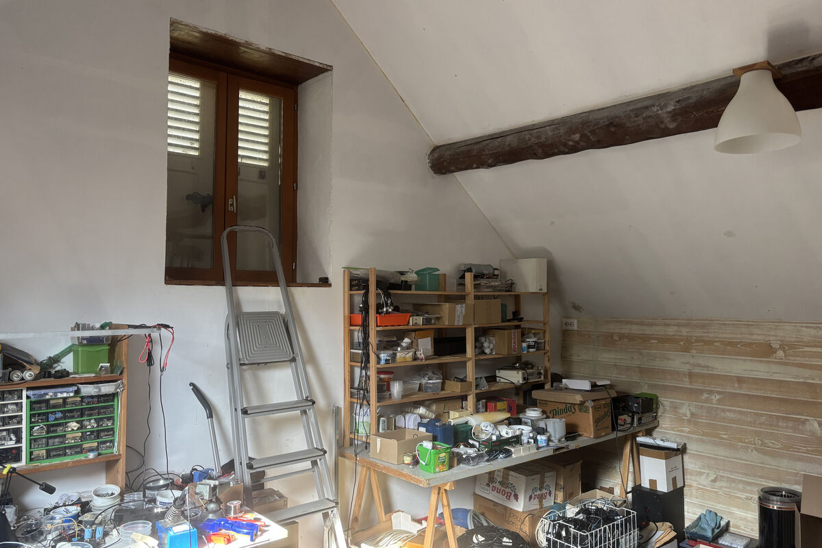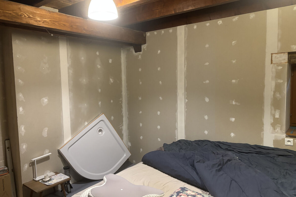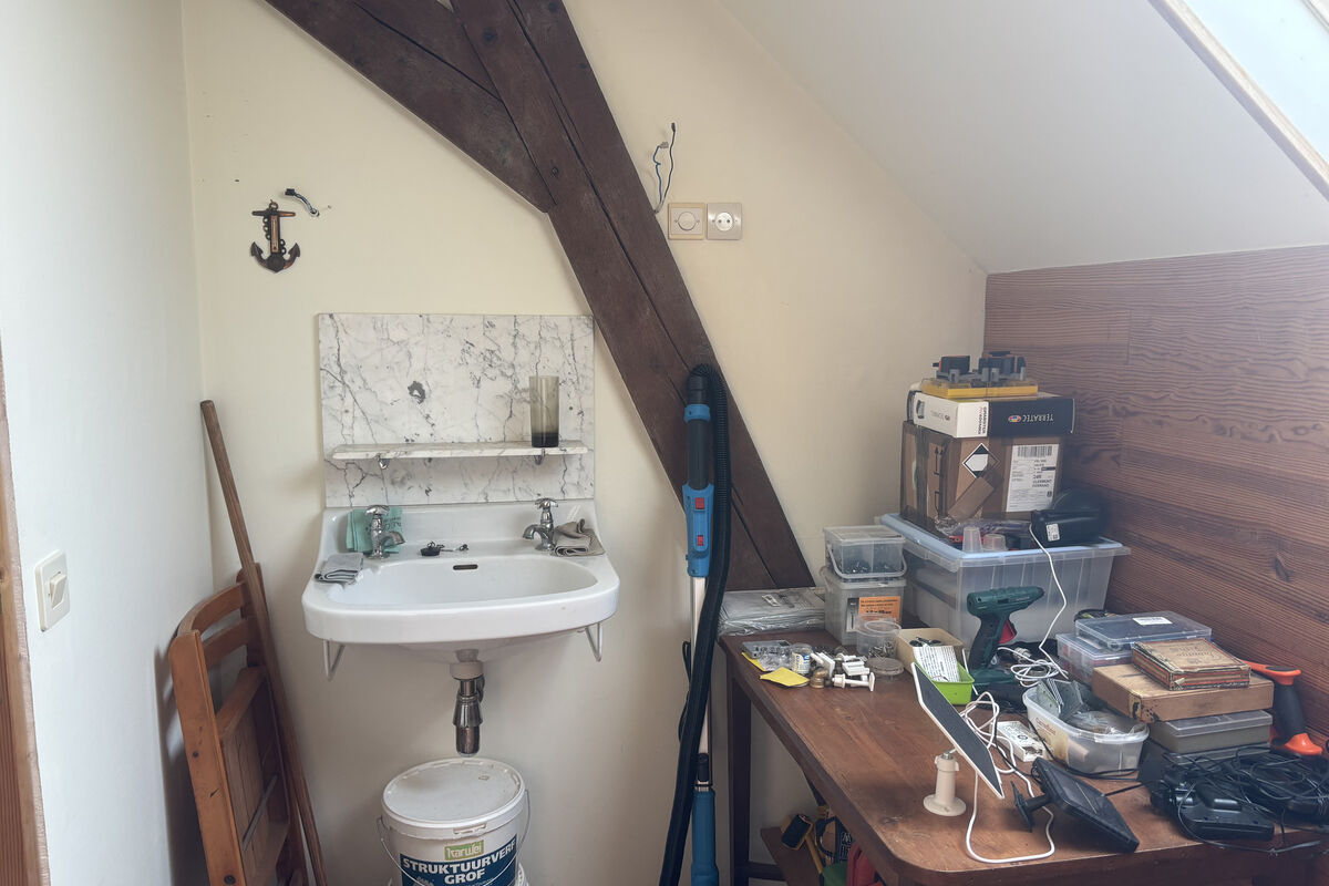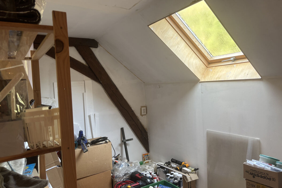 Op de ook te renoveren bovenverdieping komt u op een ruime overloop met dressing en een apart toilet met wastafeltje (nog aan te sluiten). Links een grote ruimte die kan worden ingericht als slaapkamer, waar twee ramen al klaar staan om geplaatst te worden. Rechts een halletje met bergruimte, een toekomstige badkamer en een derde kamer die als slaapkamer kan worden afgewerkt. Een vlizotrap biedt toegang tot de kleine zolder voor wat extra opslagruimte.