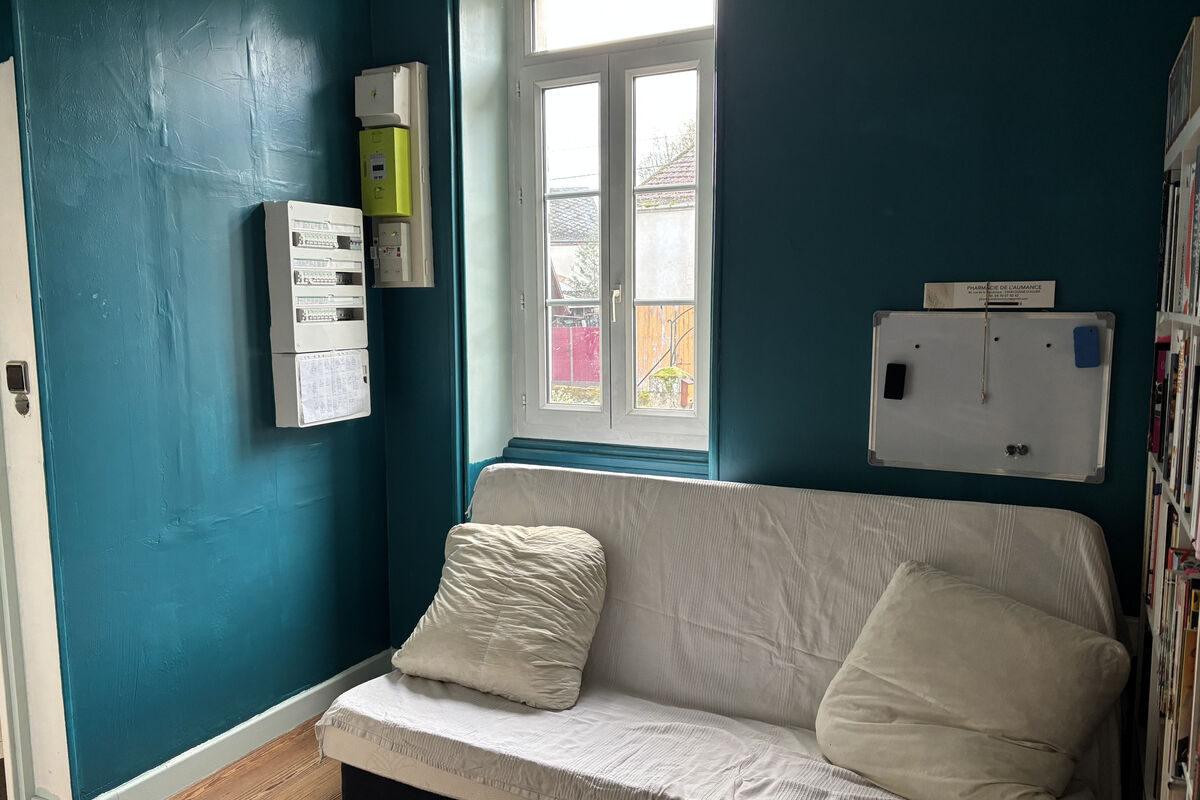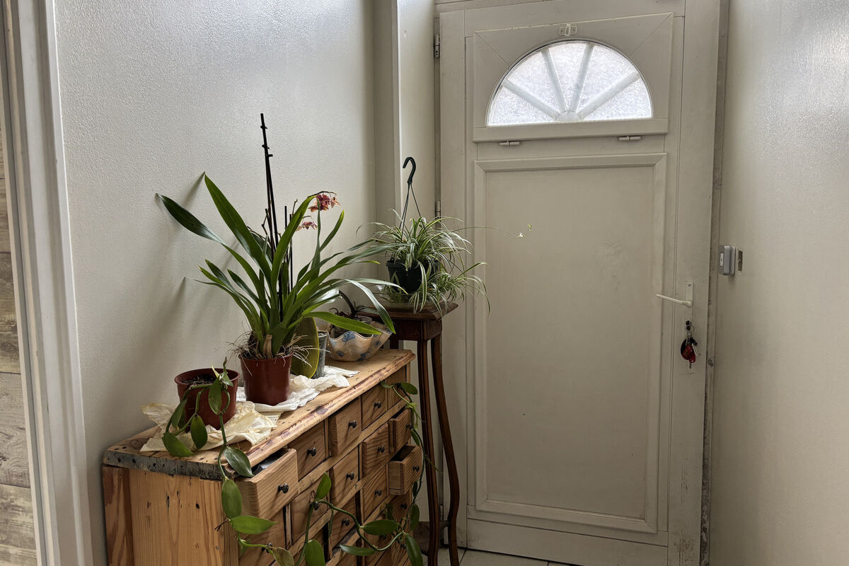De woning is opgedeeld in verschillende delen en beschikt over drie aparte ingangen voor de woonruimte, het atelier en de bovenverdieping.