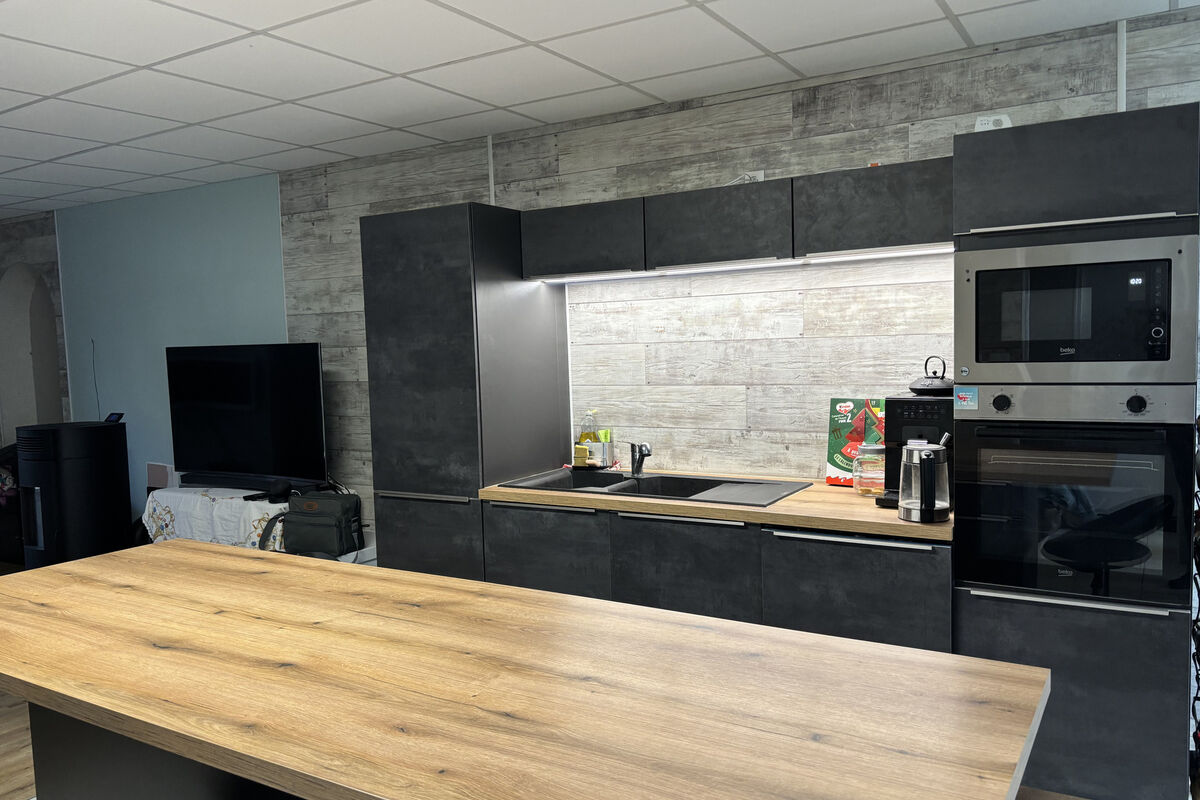 De woning wordt aan de voorzijde betreden via een hal die links toegang geeft tot een slaapkamer, momenteel in gebruik als kantoor, met een toiletruimte waarvan de installatie nog afgewerkt moet worden. Rechts bevindt zich de leefruimte met een ruime open keuken voorzien van een centraal eiland, vier gaspitten, een aansluiting voor een vaatwasser, een elektrische oven, een magnetron en een ingebouwde koelkast en vriezer. Aansluitend ligt de salon met een pelletkachel. Vanuit deze ruimte is er toegang tot de binnenplaats, het atelier en de tweede slaapkamer met een aangrenzende badkamer met douche, wastafel, energiezuinige boiler en handdoekradiator.