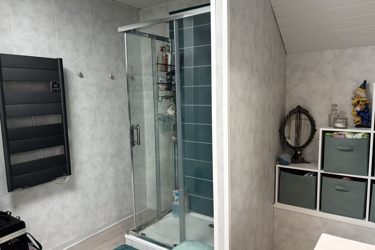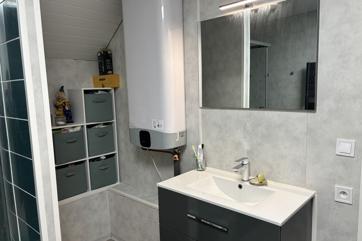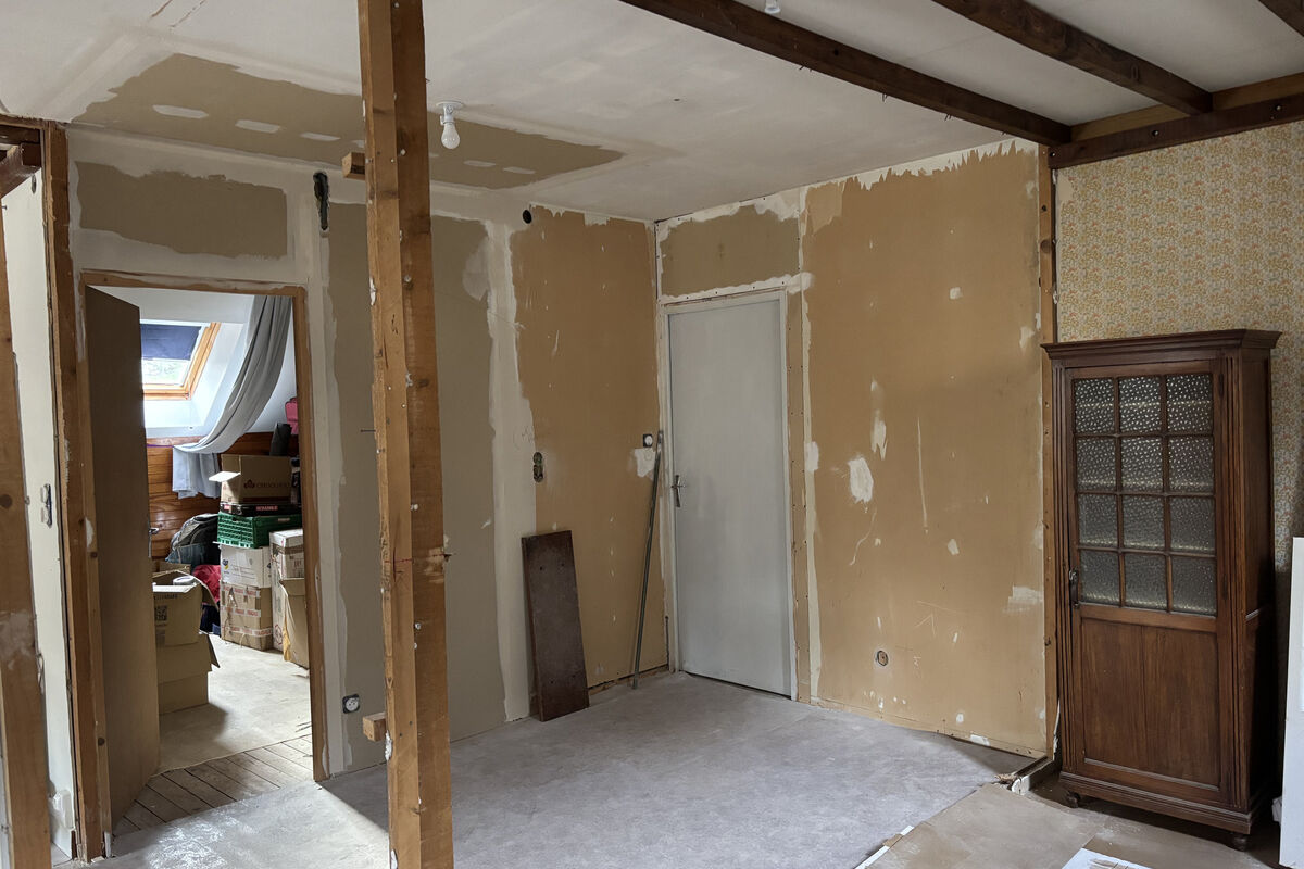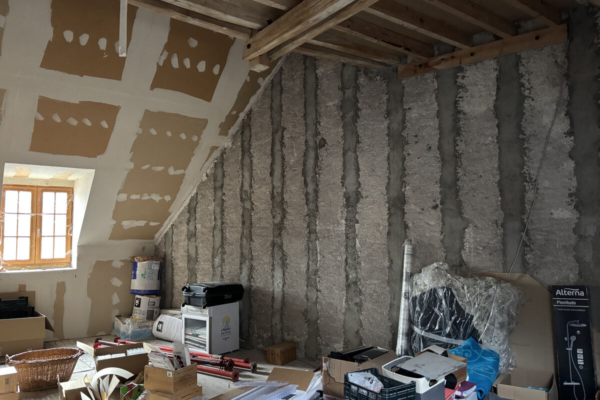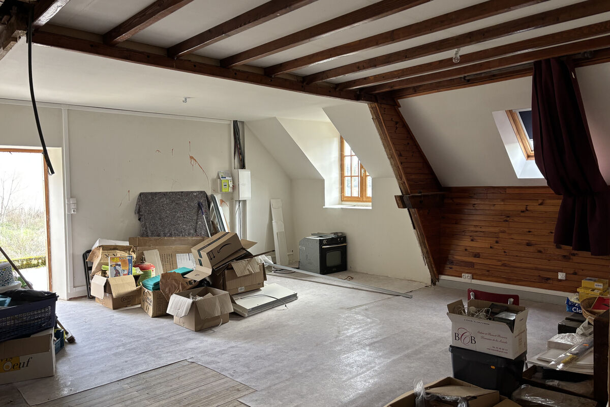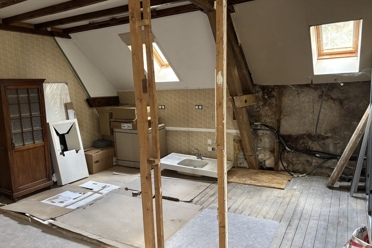 Aan de zijkant van de woning leidt een stenen trap naar de bovenverdieping, een volledig zelfstandige ruimte. Hier is een klein terras met uitzicht op het kasteel. Deze verdieping is nog volledig te renoveren, waarbij de elektrische installatie reeds is uitgevoerd. Dankzij de aparte ingang biedt deze ruimte uitstekende mogelijkheden voor verhuur, zoals een bed & breakfast of gîte. Er is wel al een toilet aanwezig.