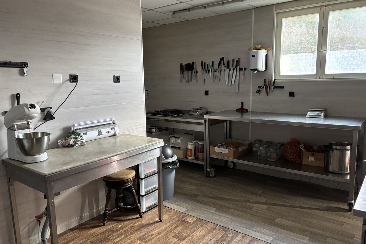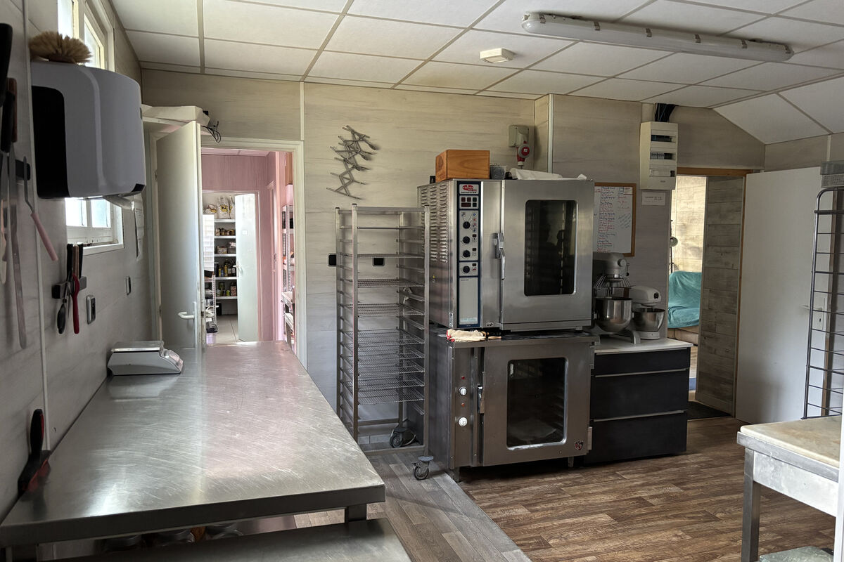 Vanuit de salon geeft een deur toegang tot de voormalige banketbakkerij. Dit bestaat uit een centrale ruimte met vier gaspitten, een aparte ruimte met waterpunt voor de afwas en een eigen boiler, en loopt door naar de voormalige winkel met een deur naar buiten en een privéparkeerplaats. Verder bevinden zich hier een wc met wastafel en een laatste bergruimte. Van deze ruimte is een B&B te maken.