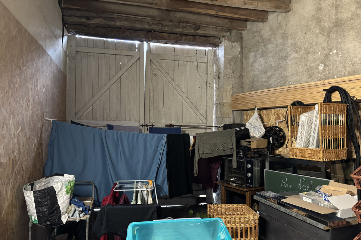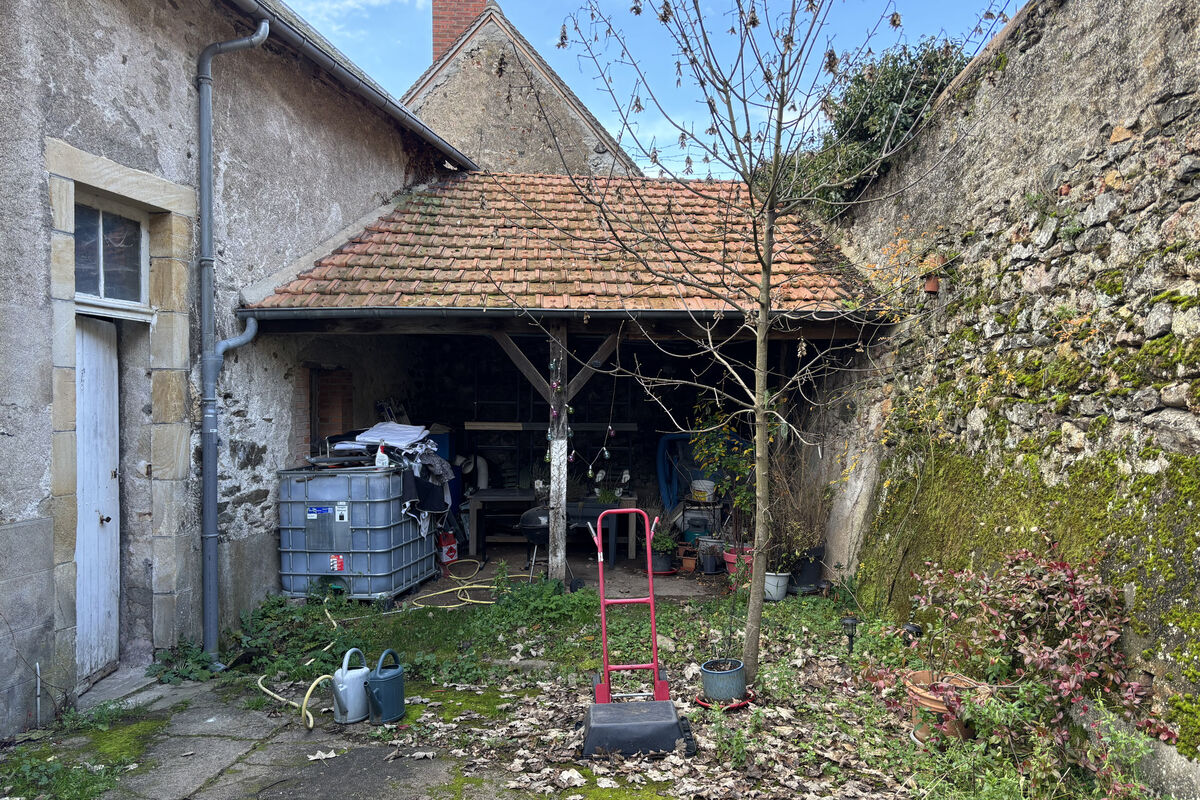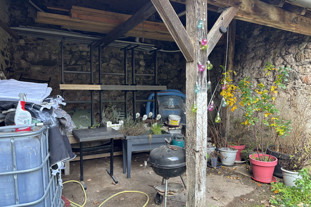 Een andere deur vanuit de salon leidt naar de binnenplaats met twee overkappingen en een doorgang naar de ruime schuur. Deze heeft grote deuren naar de binnenplaats aan de voorzijde van het huis en bevat een houten tuinhuisje dat kan dienen als atelier. Hier is tevens een aansluiting voor een wasmachine aanwezig.