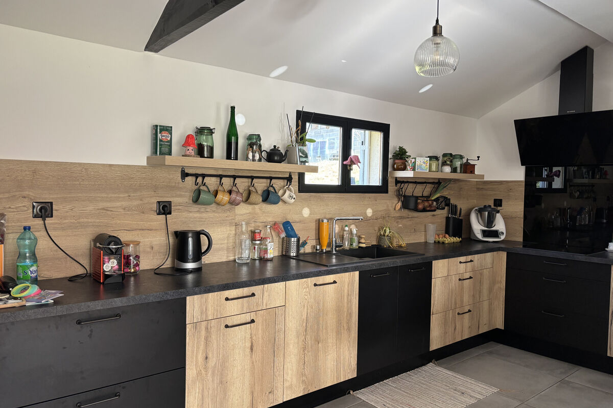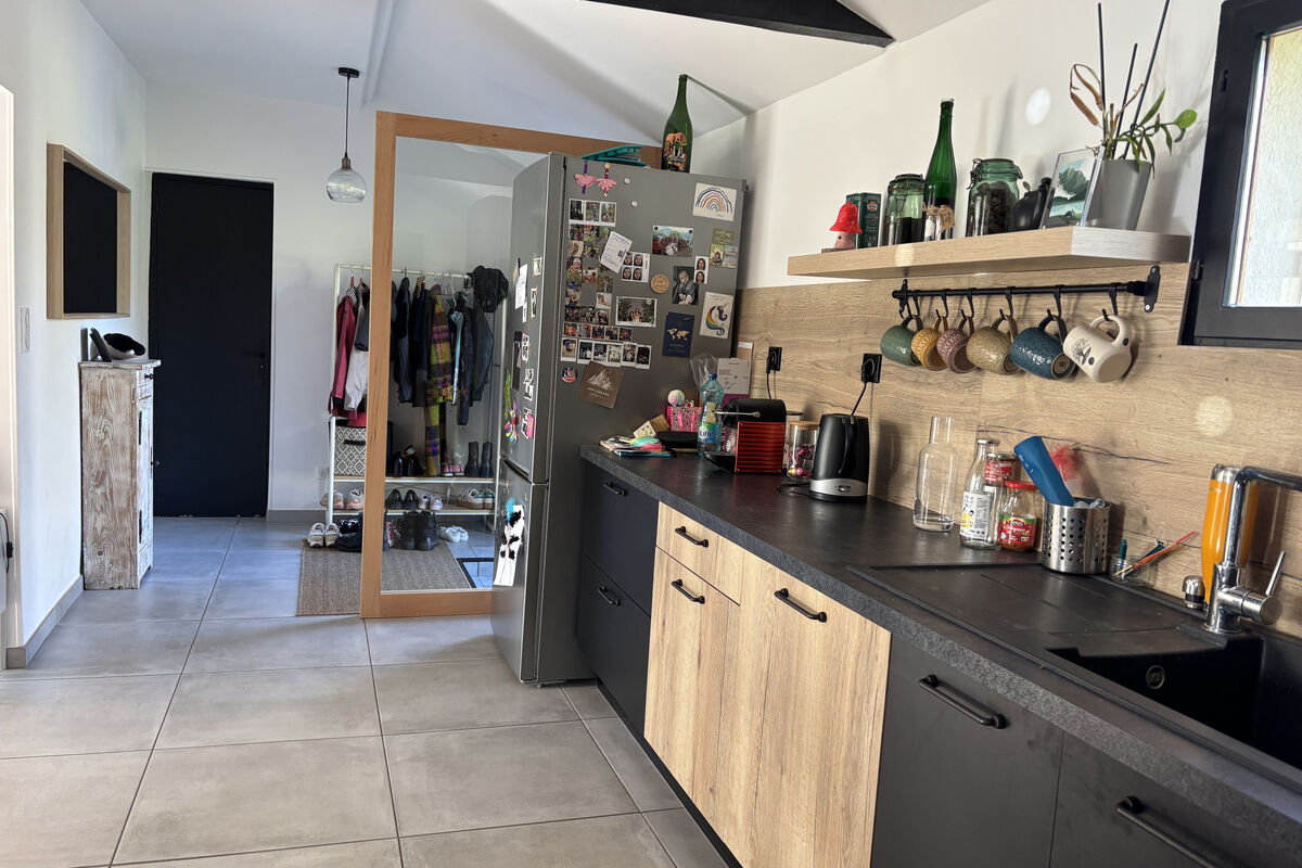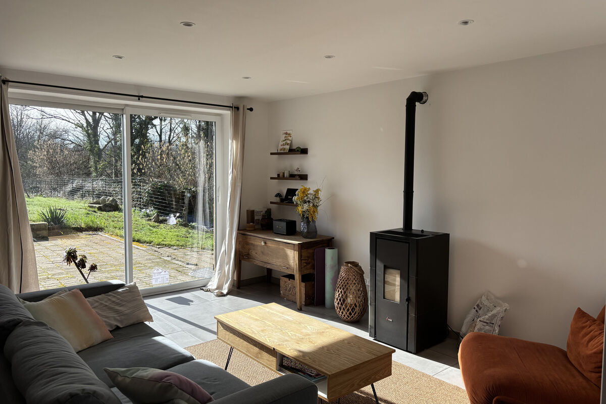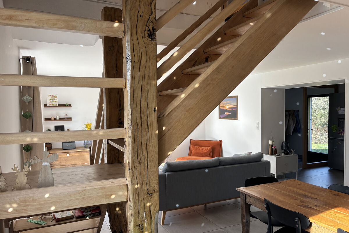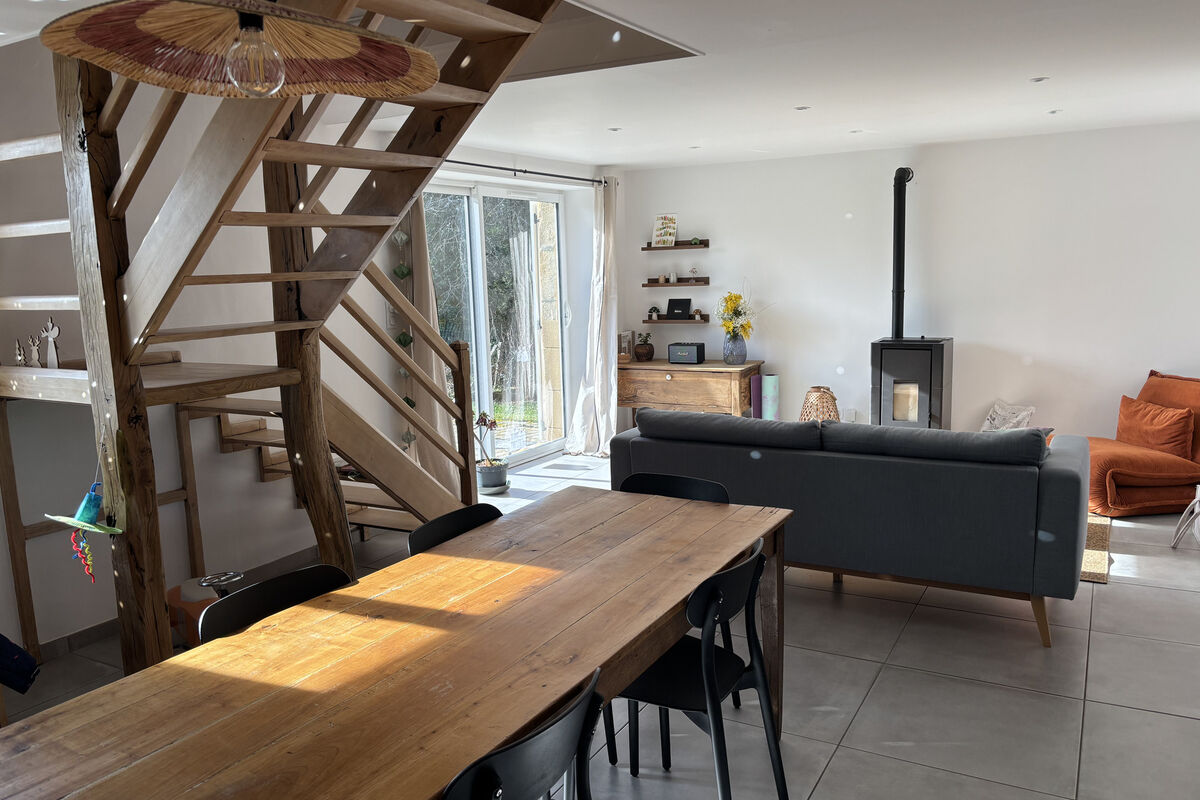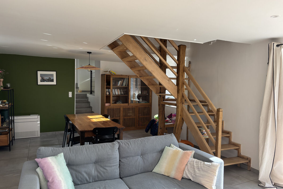 Bij binnenkomst komt u in de open hal, die rechts toegang geeft tot de bijkeuken met aansluiting voor een wasmachine. Links bevindt zich de grote en lichte leefruimte met een recente, semi-open keuken voorzien van een ingebouwde oven, vaatwasser en inductiekookplaat. De salon beschikt over een pelletkachel en een grote schuifpui die zorgt voor veel lichtinval en direct uitzicht op de achtertuin. Het eetgedeelte is ruim opgezet en voorzien van een mooie eikenhouten trap naar de bovenverdieping en een recente airconditioning (warm/koud).