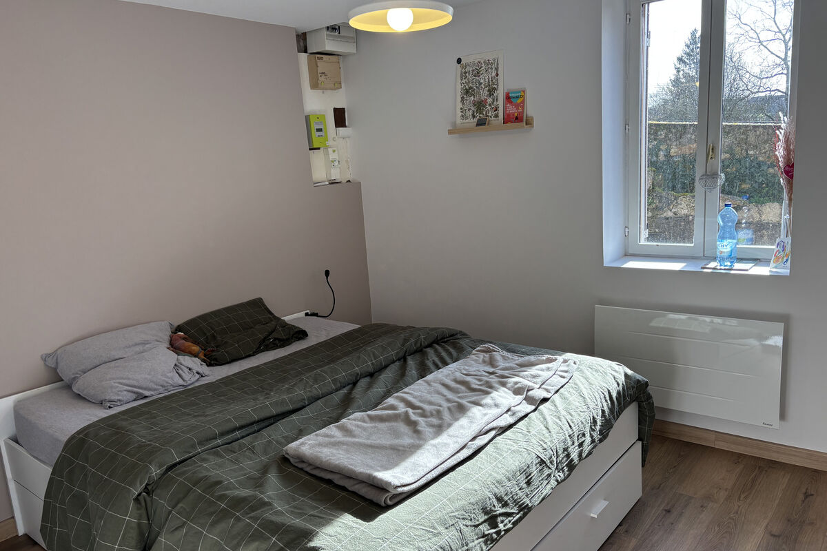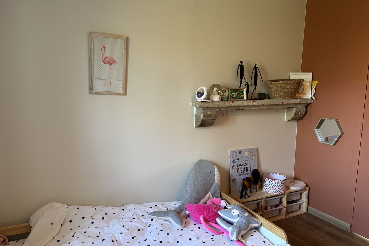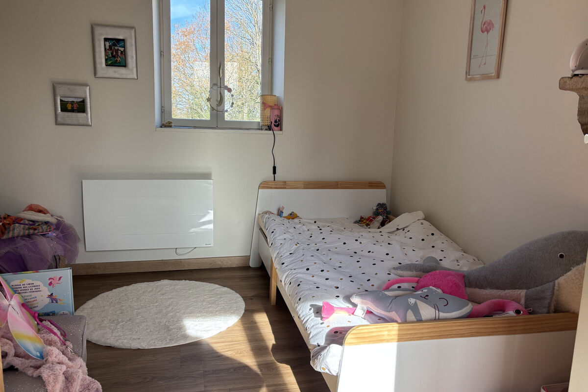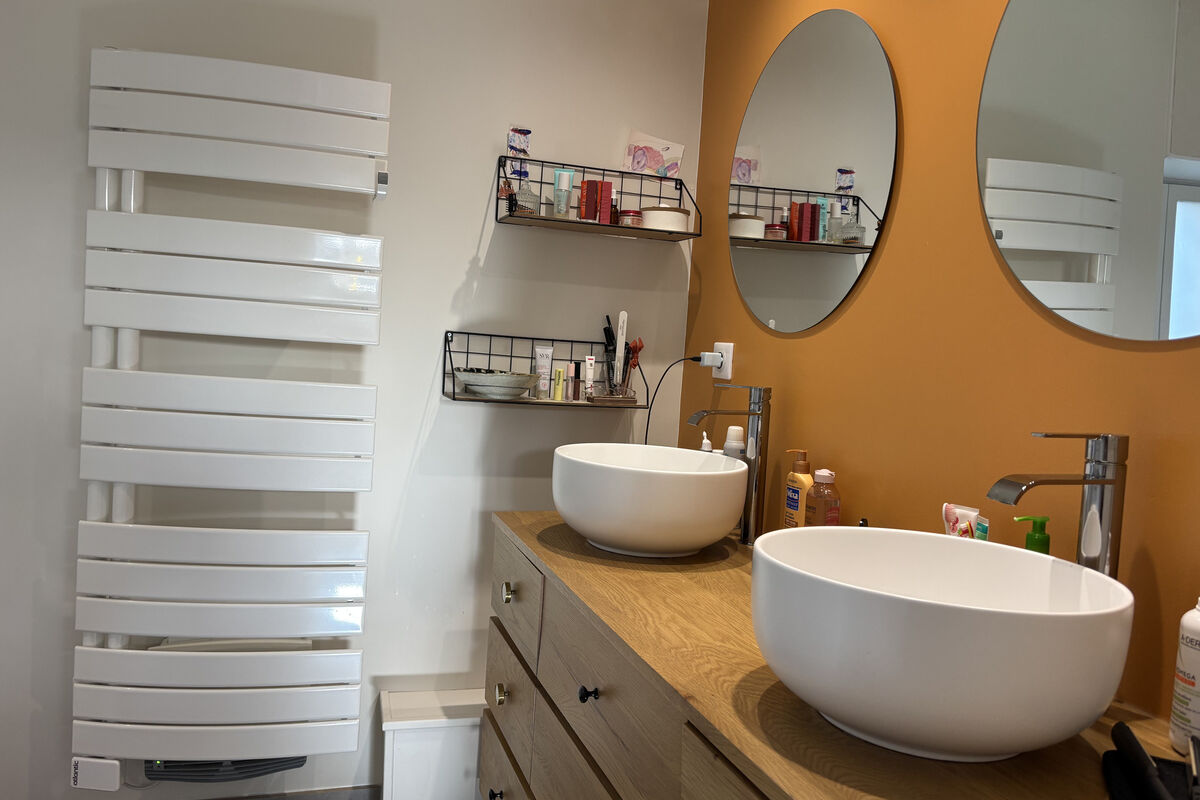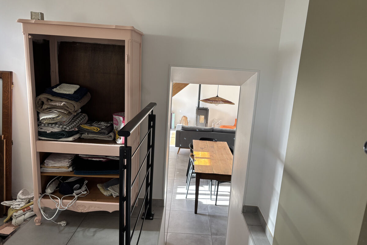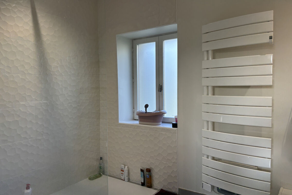 Vanuit de eetruimte leiden enkele treden naar het tweede deel van de woning, via een overloop met een deur naar de achtertuin. Links bevindt zich een schuifdeur naar de badkamer met dubbele wastafel, inloopdouche, ventilatiesysteem en handdoekradiator. Via enkele treden komt u in het slaapgedeelte met een apart toilet met wastafel, een kinderkamer van 8,8 m² en een ruime slaapkamer met dressing.