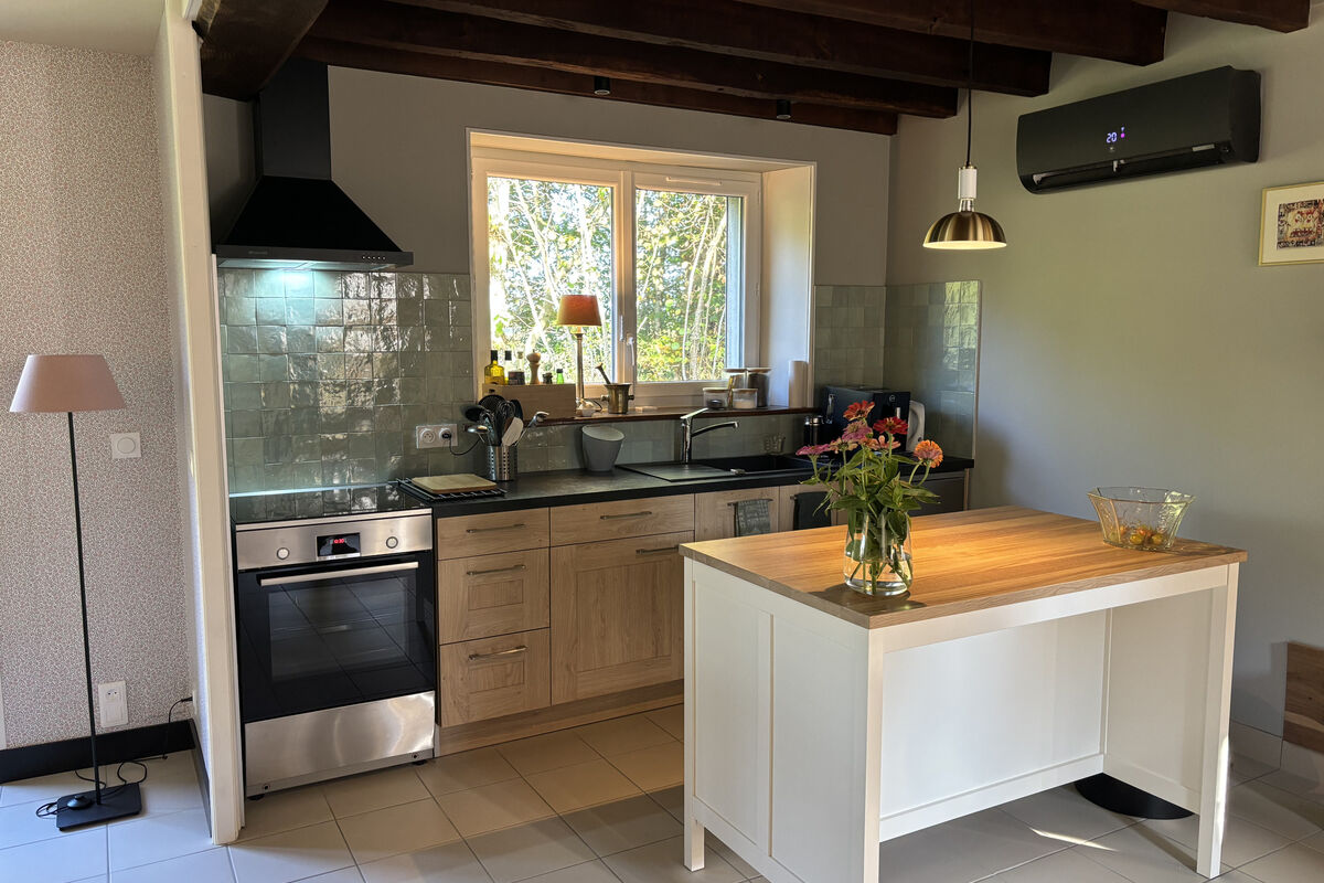 Bij binnenkomst in de hal bevindt zich links een opbergkast. Rechts komt u in de gezellige woonruimte met een nieuwe houtkachel, ingebouwde kast en open keuken waar plek is voor een elektrisch kooktoestel. Hier vindt u ook de trap naar de bovenverdieping en een airco-installatie die zowel voor koeling als verwarming zorgt. De ruimte loopt door naar de eetkamer waar openslaande deuren toegang geven tot de achtertuin.