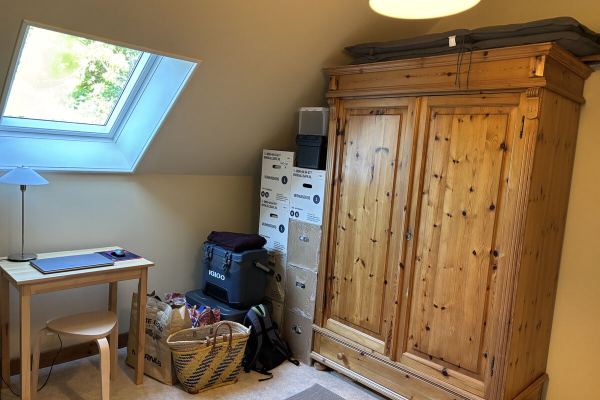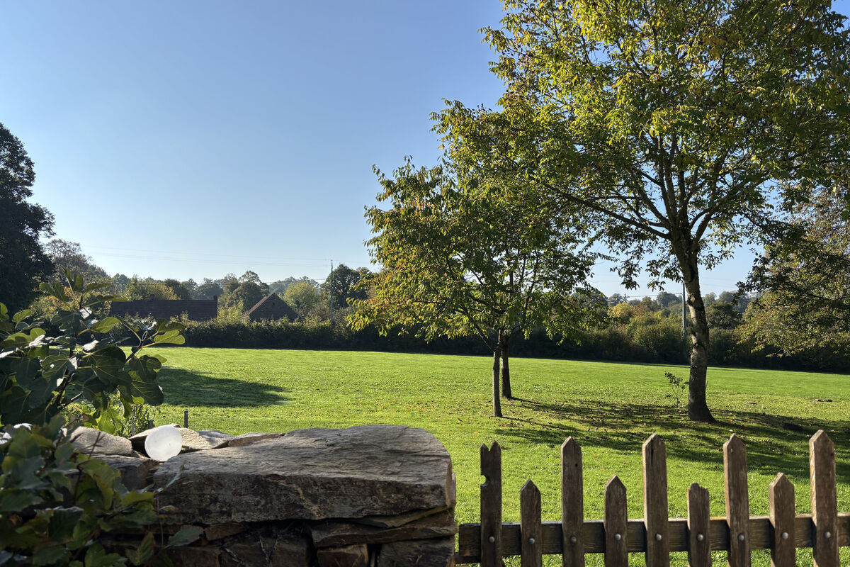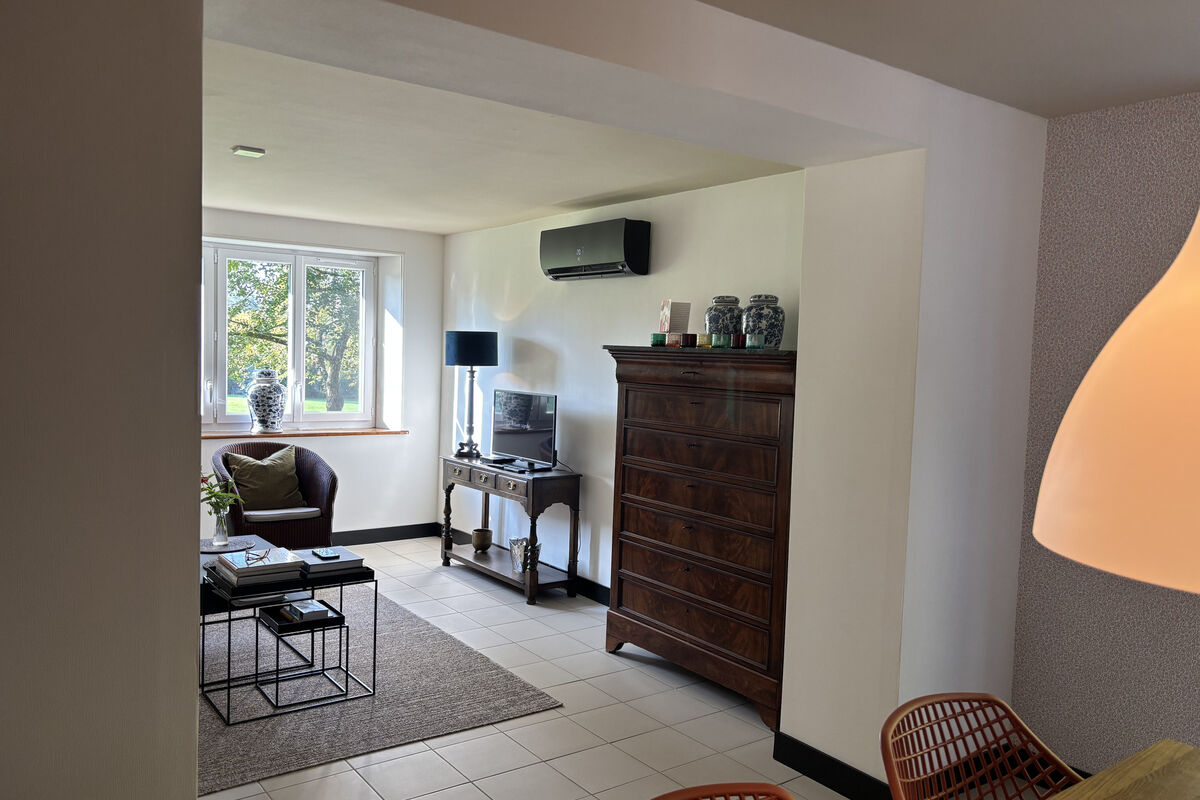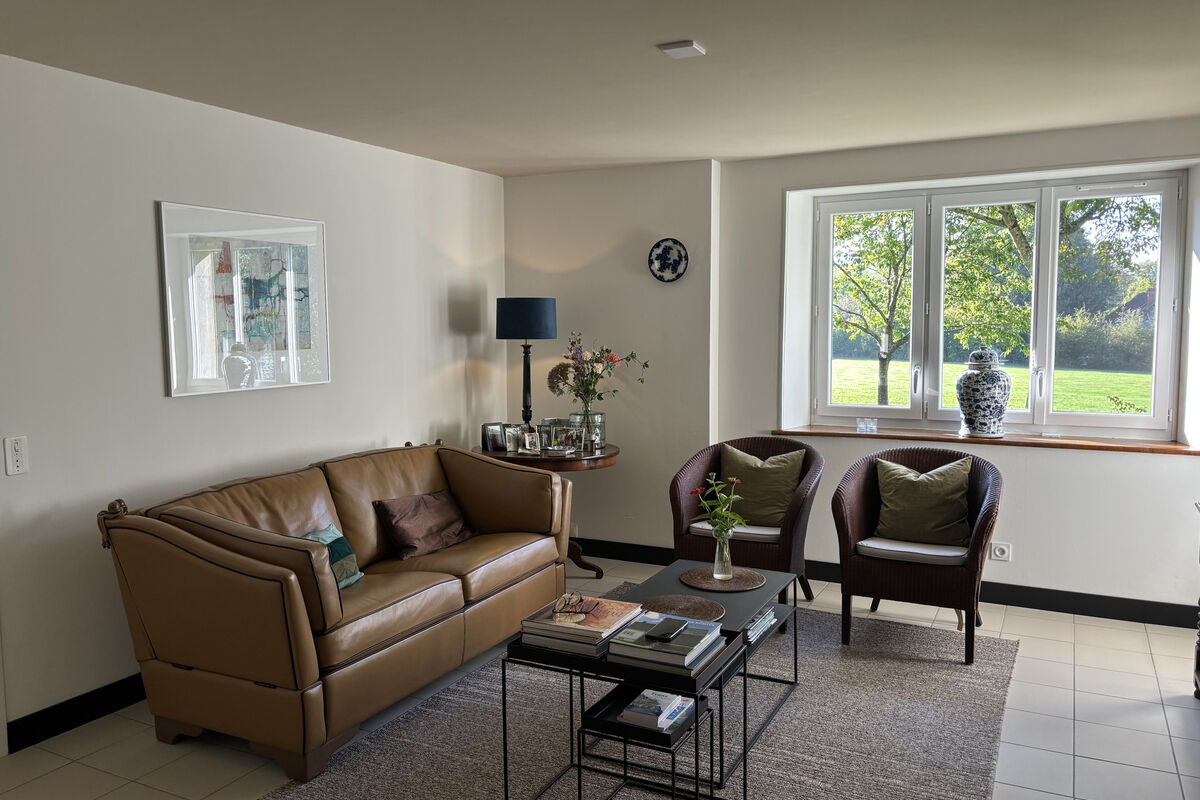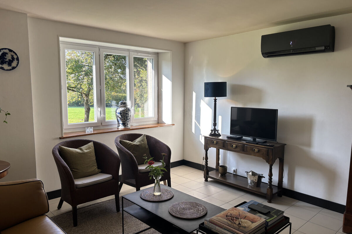Vanuit de eetkamer komt u in de zitkamer, eveneens voorzien van een airco (koeling/verwarming) en een groot raam met prachtig uitzicht over het eigen weiland.
