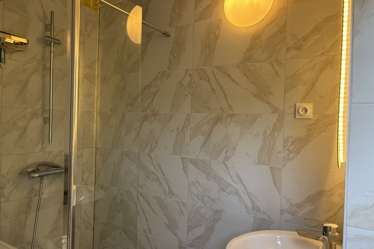 Een deur vanuit de zitkamer leidt naar een halletje met een apart toilet en de eerste badkamer, uitgerust met douche, wastafel, handdoekradiator, aansluiting voor de wasmachine en de warmwaterboiler.