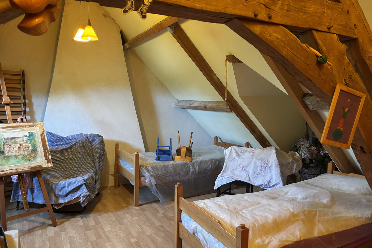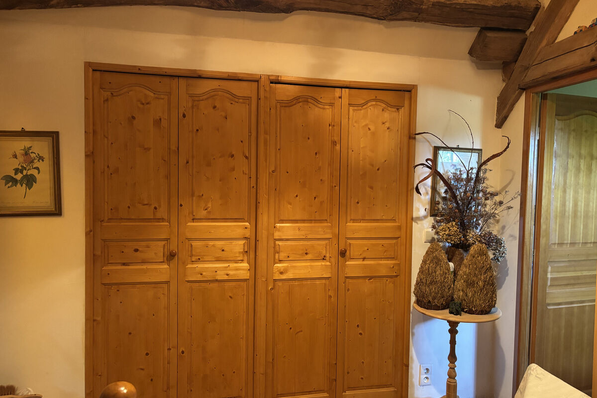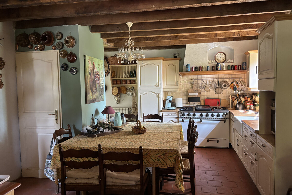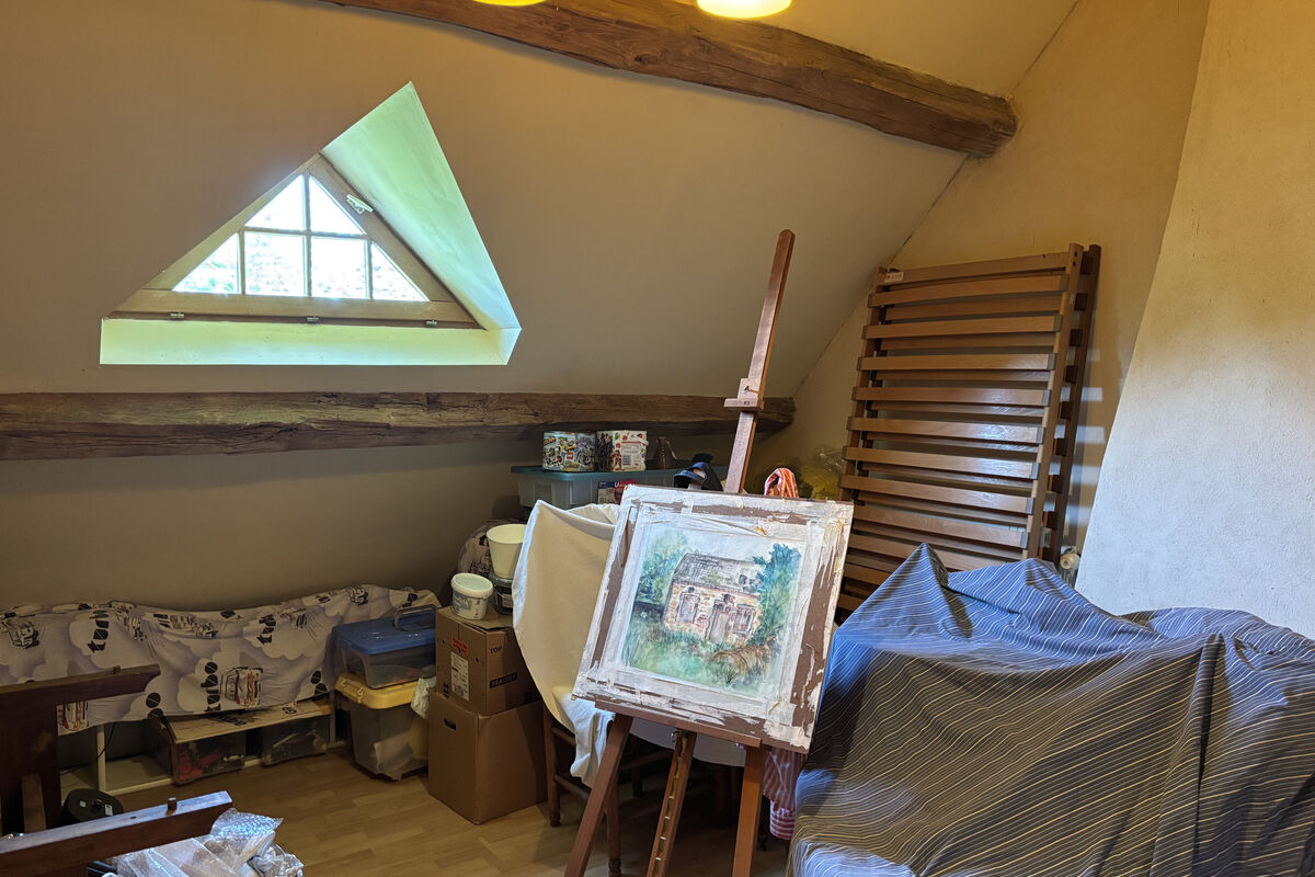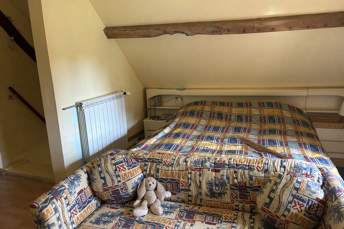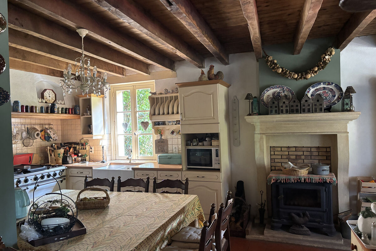 Aan de rechterkant komt u in de ruime leefkeuken, voorzien van een Godin gasfornuis, houtkachel, mooie tegelvloer, balkenplafond, trap naar de bovenverdieping en een handige inbouwkast. Vanaf hier leidt de trap naar de eerste ruime slaapkamer met uitzicht op het omliggende land.