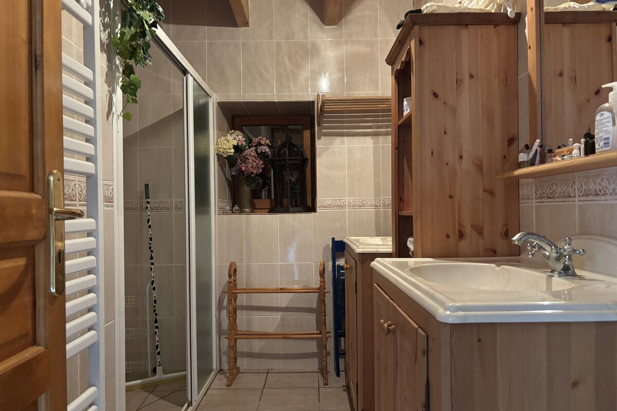 Via de veranda komt u binnen in een halletje, die toegang geeft tot verschillende vertrekken. Links vindt u een apart toilet, een deur naar de CV-ketel voor de centrale verwarming op gas en de badkamer met douche, wastafel en aansluiting voor de wasmachine.