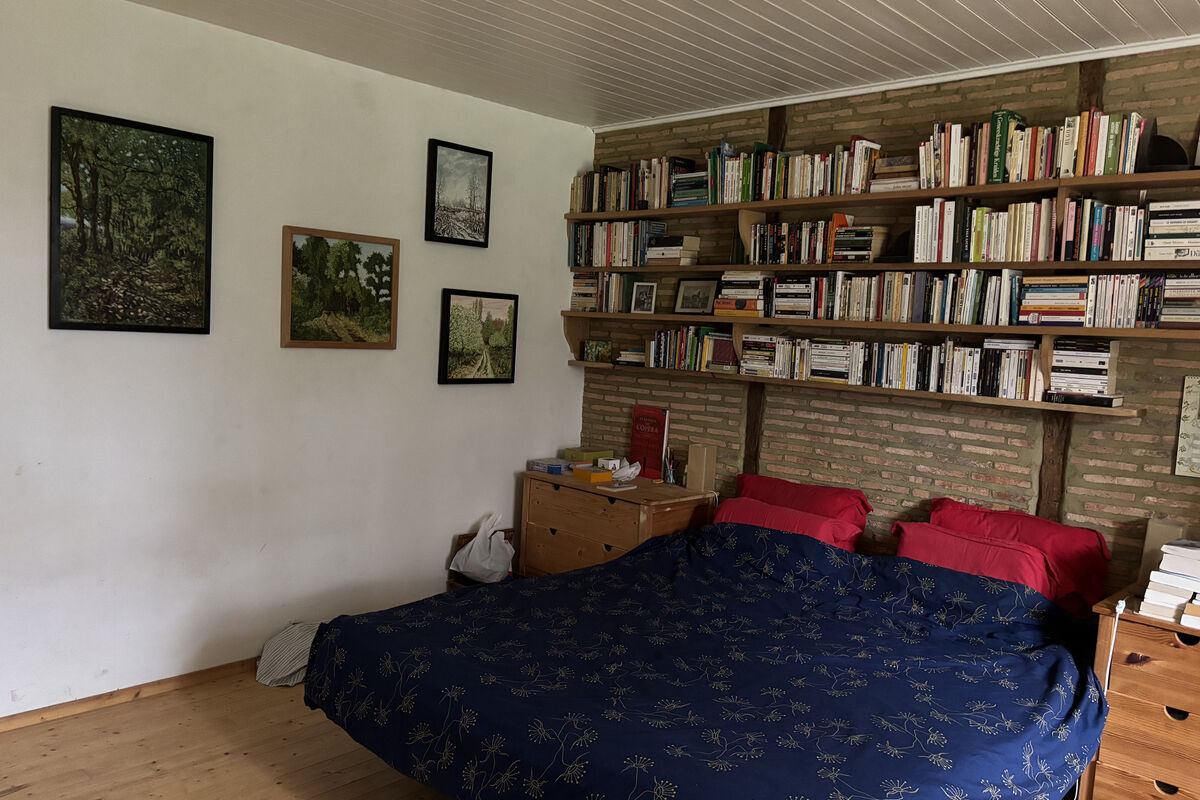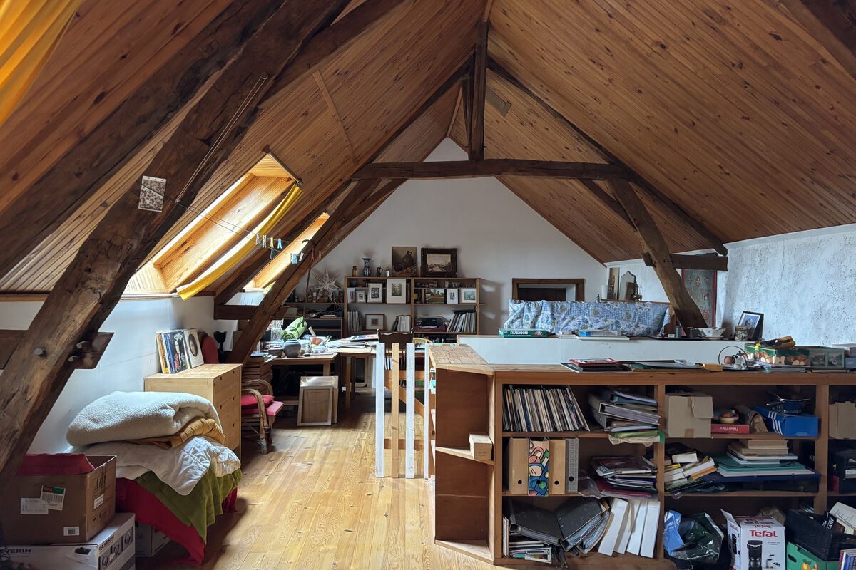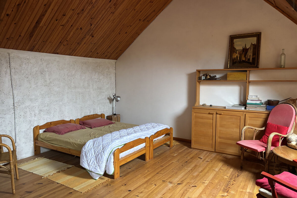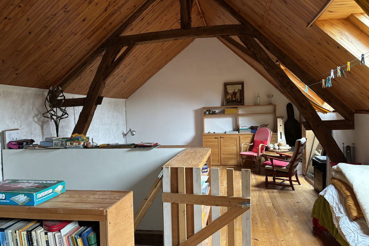 In de keuken is een deur naar een hal met de trap naar de grote bovenverdieping met 3 Velux dakramen waar nu één slaapkamer is en werkgedeelte maar waar makkelijk twee zeer ruime kamers gemaakt kunnen worden waarvan één met wastafel doordat de trap in het midden zit. Achter de achterste wand is nog opbergruimte gemaakt.