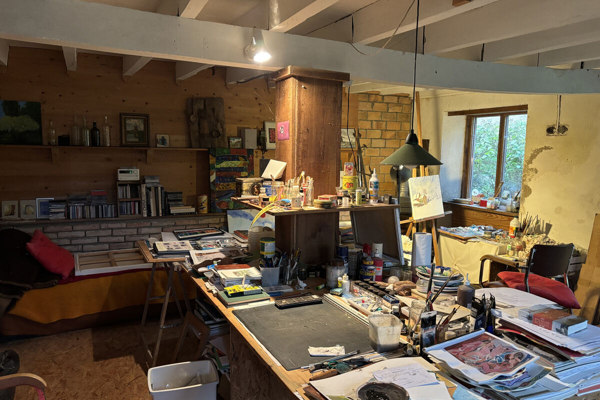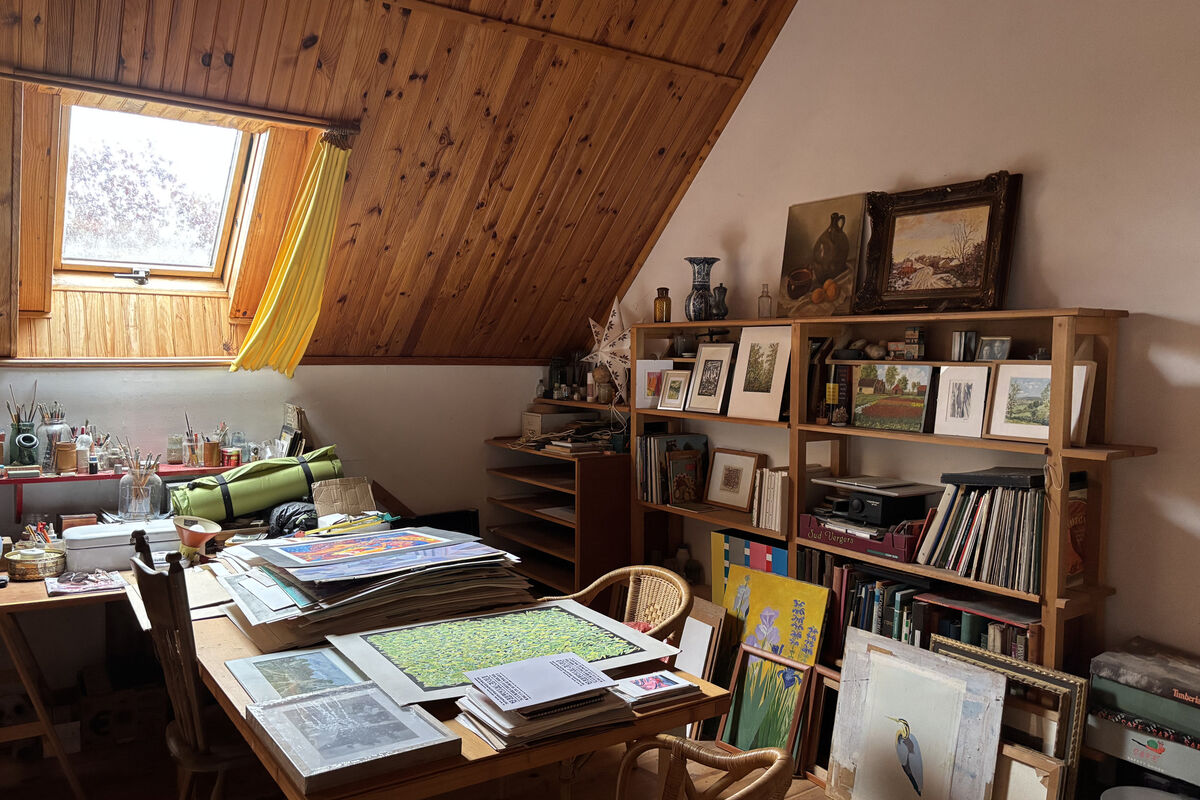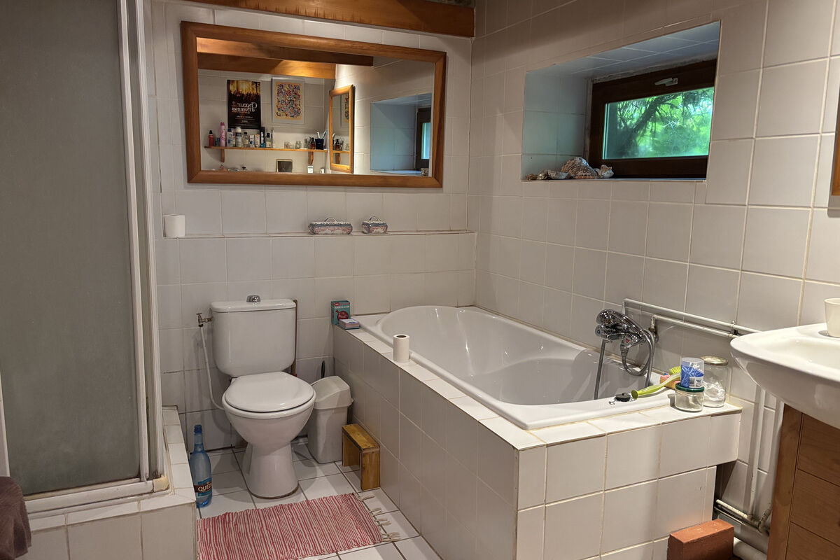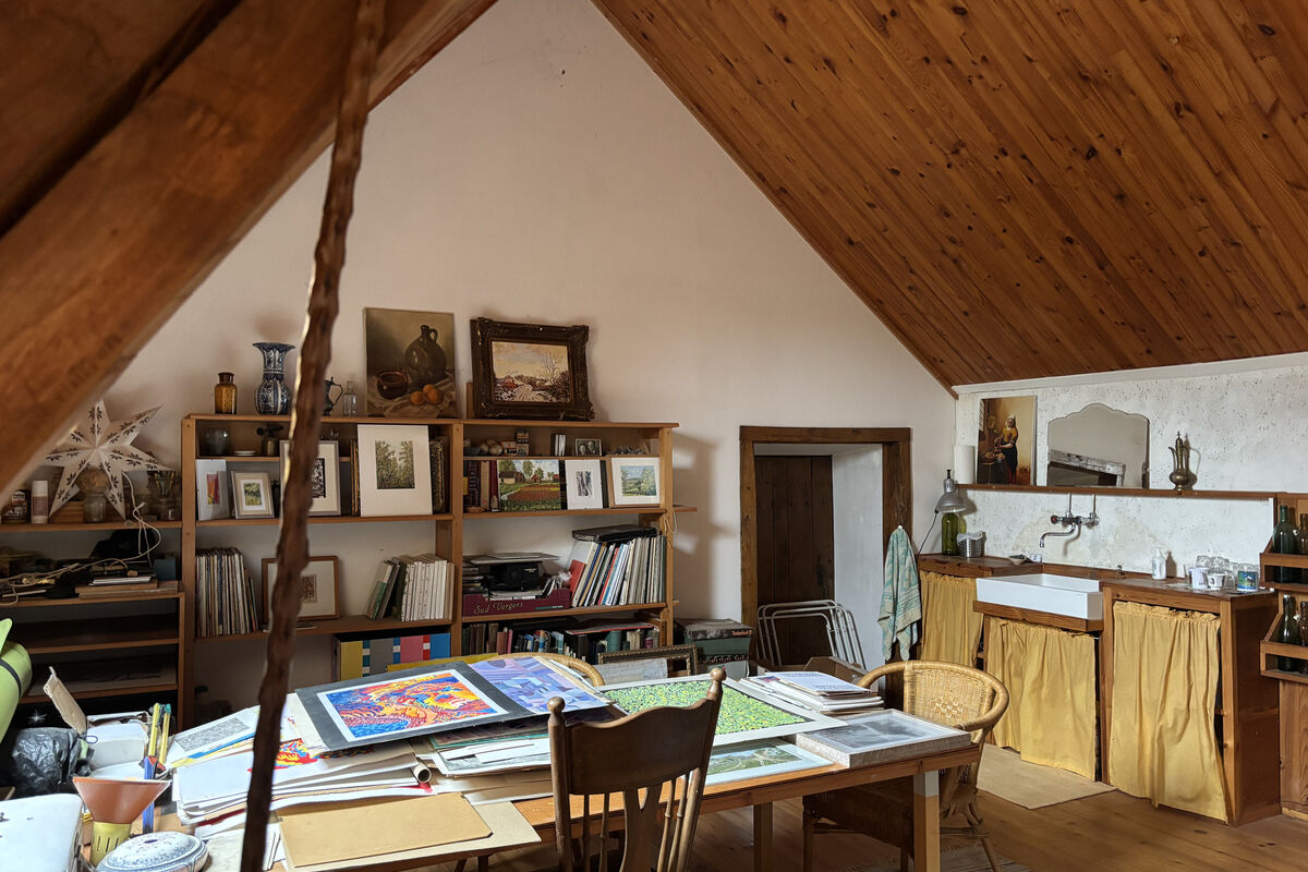 In de keuken is een deur naar een hal met de trap naar de grote bovenverdieping met 3 Velux dakramen waar nu één slaapkamer is en werkgedeelte maar waar makkelijk twee zeer ruime kamers gemaakt kunnen worden waarvan één met wastafel doordat de trap in het midden zit. Achter de achterste wand is nog opbergruimte gemaakt.