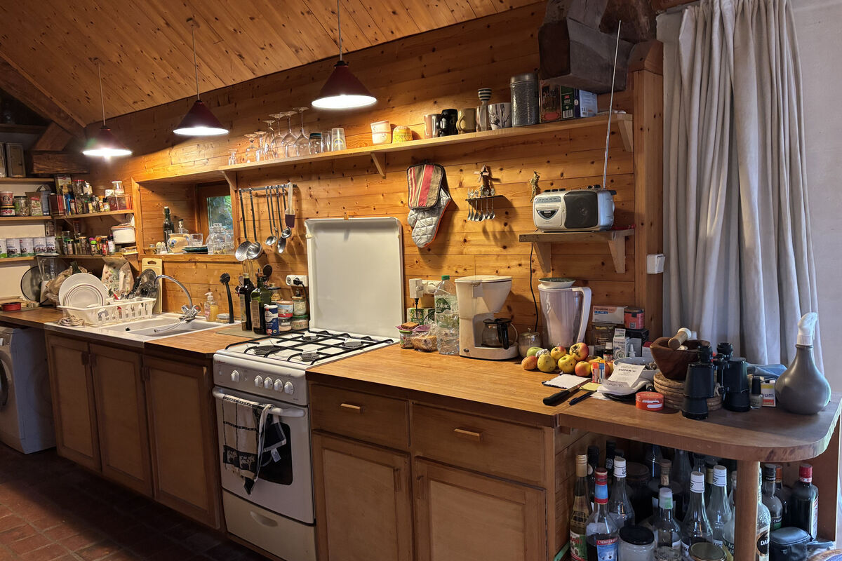 Aan uw rechterhand komt u in de Lvormige woonruimte met zitkamer, eethoek die doorloopt naar de open keuken met eveneens de oude tometten vloer. De zitkamer wordt verwarmd door een houtkachel en heeft een houten vloer die doorloopt naar de eethoek, deze is geheel geïsoleerd.. Naast de keuken is de badkamer met douchecabine, toilet, wastafel en ligbad.