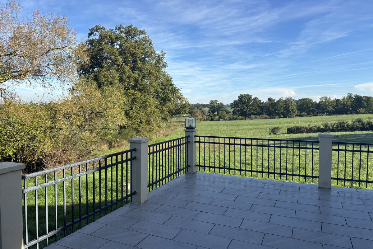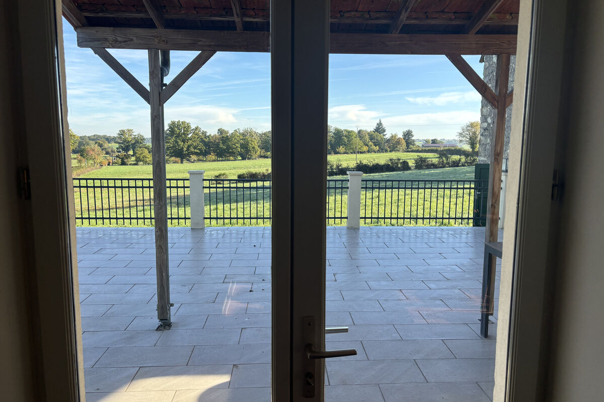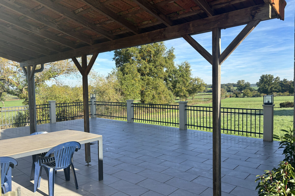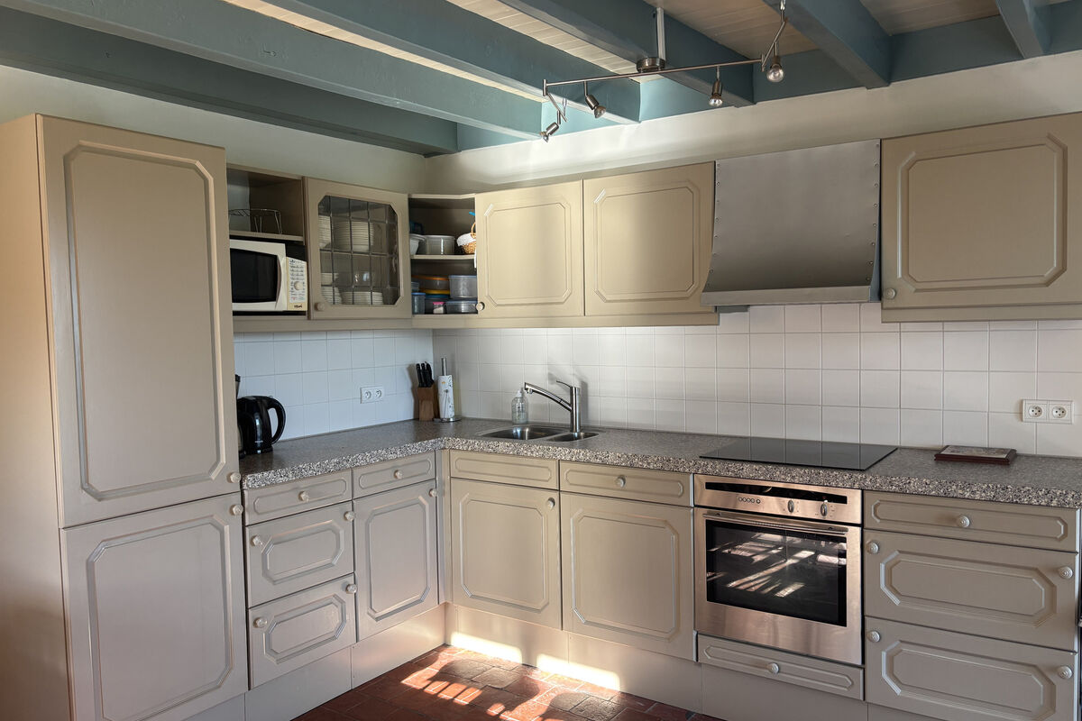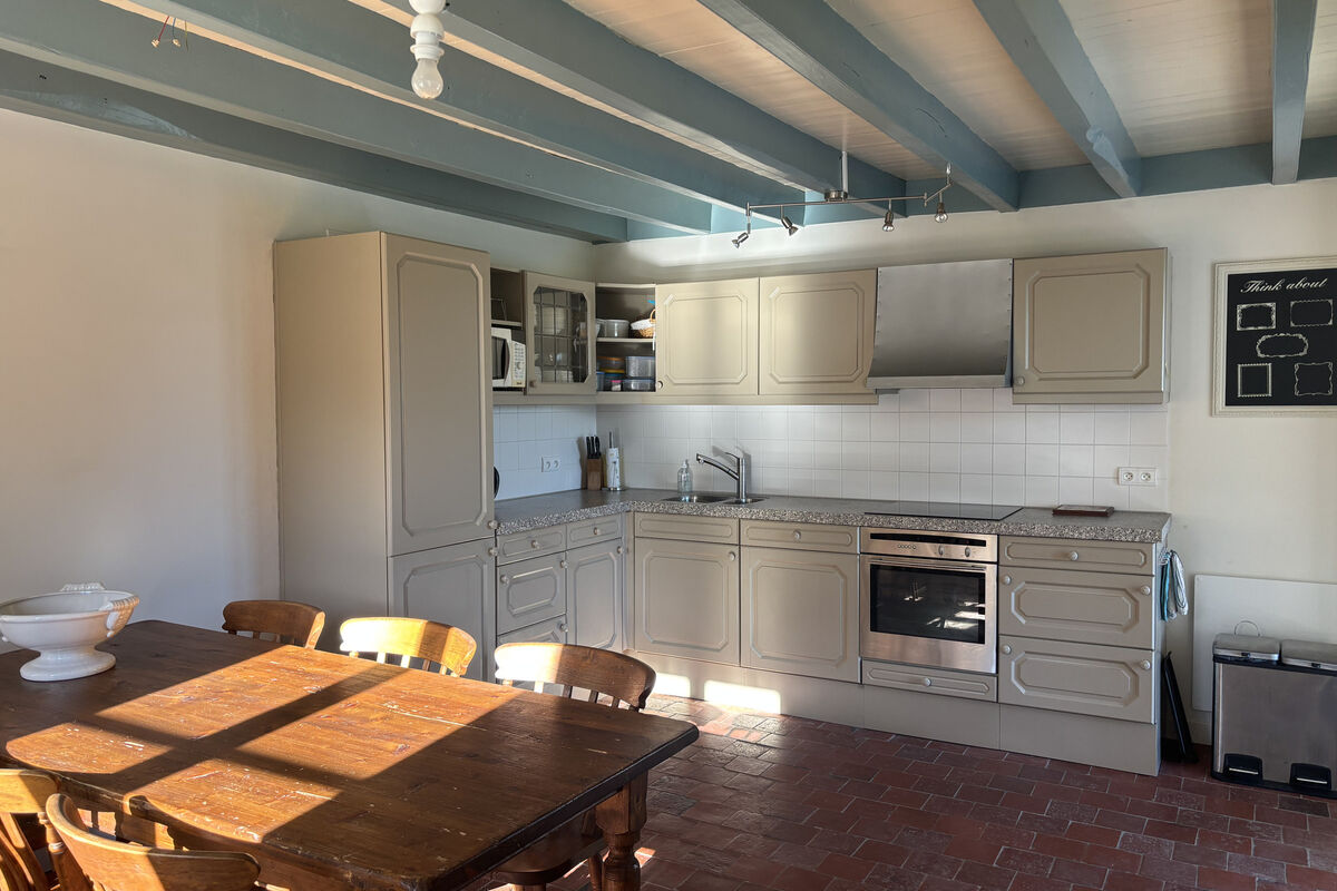 Aan de rechterkant ligt de grote leefkeuken met een houtkachel onder een mooie schouw, elektrische kookplaten, oven, ingebouwde koelkast, vriezer en vaatwasser. Vanuit de keuken geven openslaande deuren toegang tot een groot betegeld buitenterras met veranda en prachtig uitzicht over het omliggende landschap.