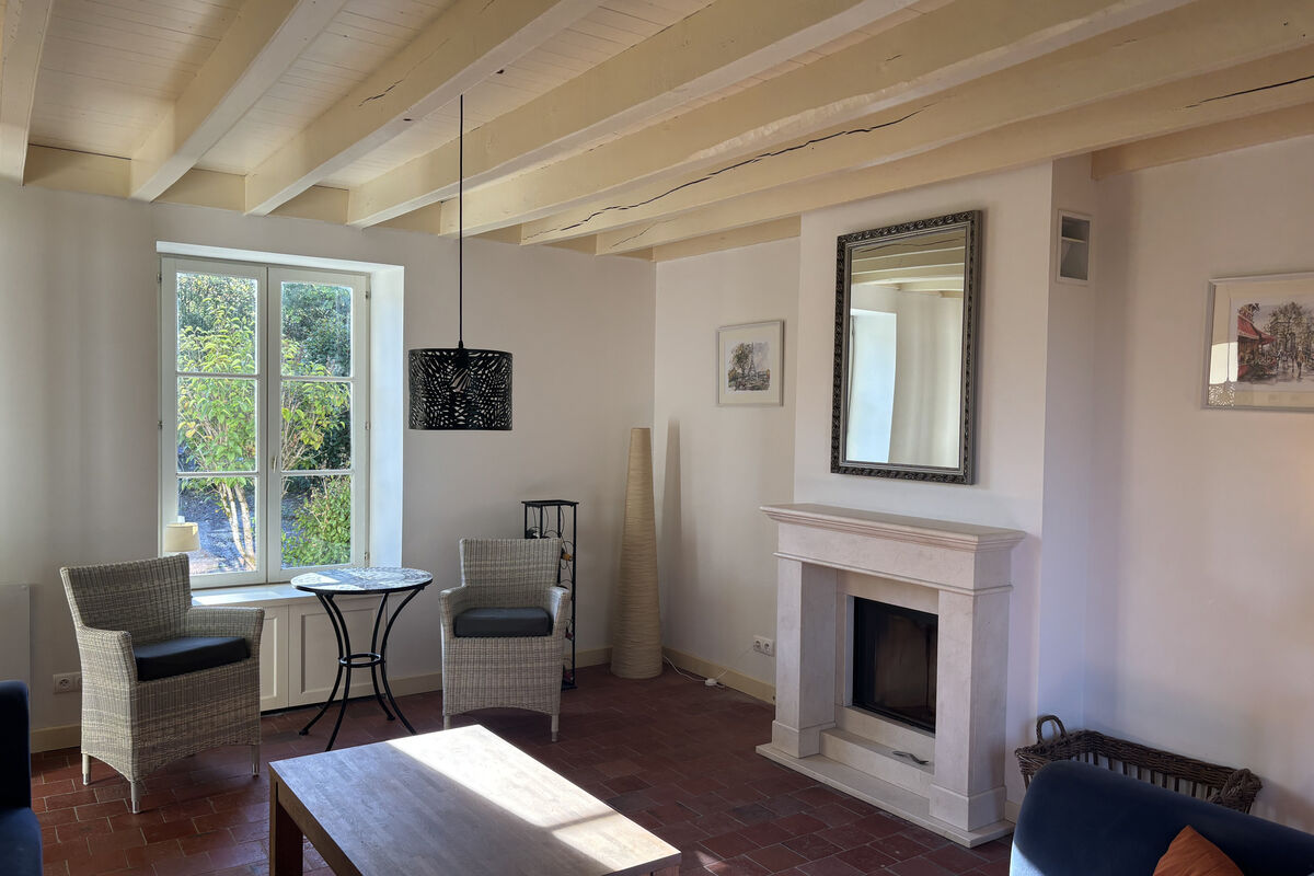 Aan de linkerkant bevindt zich de gezellige zitkamer met een ingebouwde hout insert en vloerverwarming.