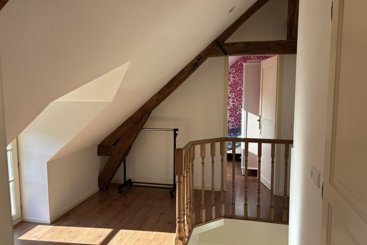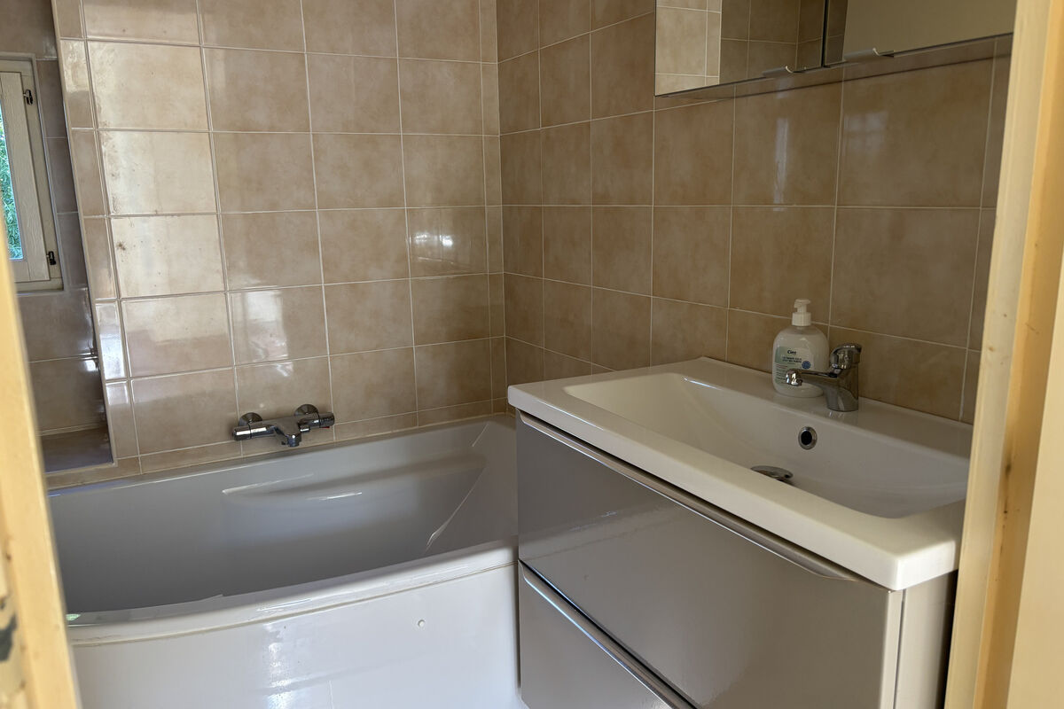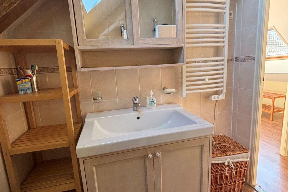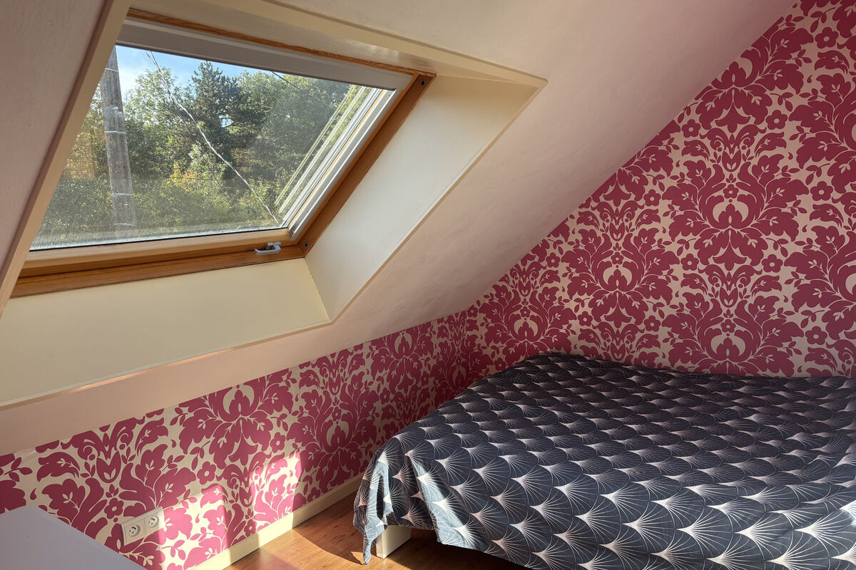Op de bovenverdieping bevindt zich een lichte overloop met erker, een badkamer met douche, toilet, wastafel en handdoekradiator. Links een ruime slaapkamer met ingebouwde kasten achter het bed en reeds voorbereide aansluitingen om een wastafel te installeren. Rechts zijn er nog twee slaapkamers en daarnaast een kast met de warmwaterboiler.