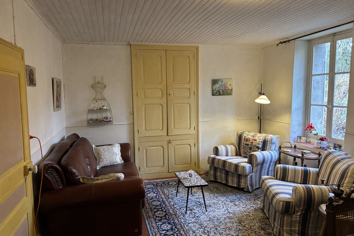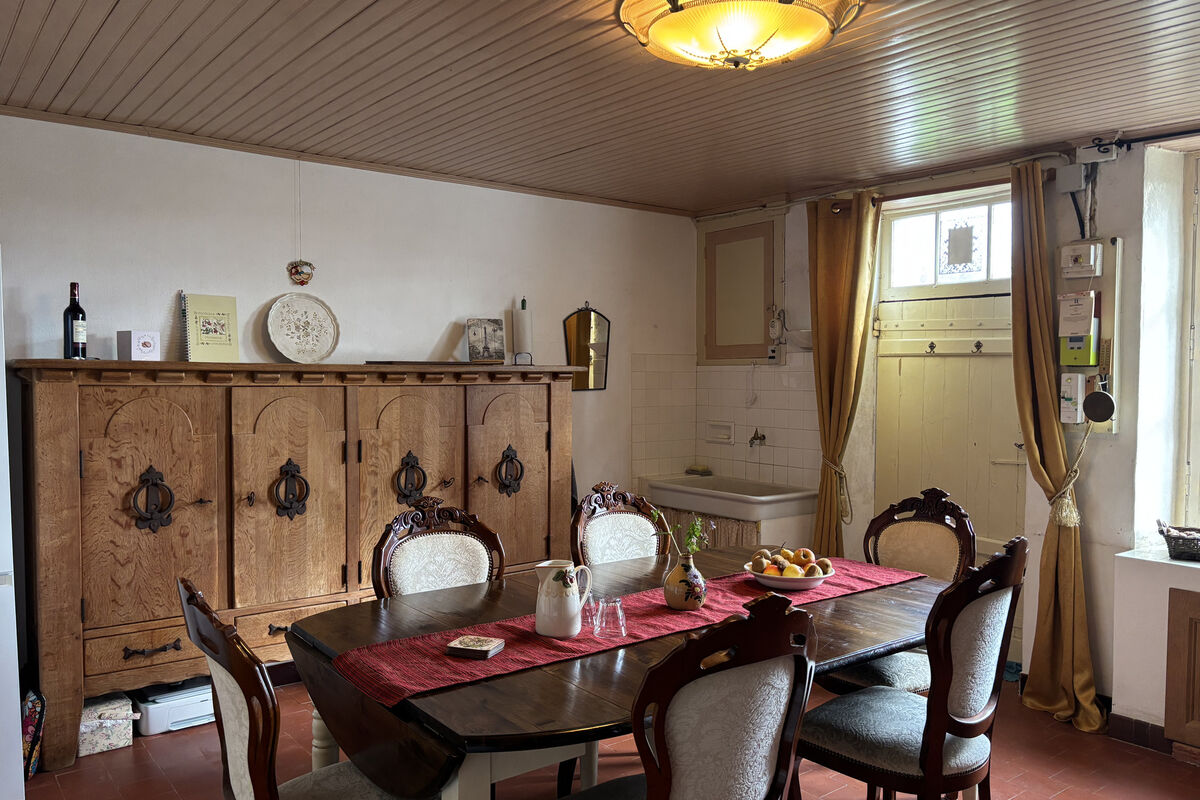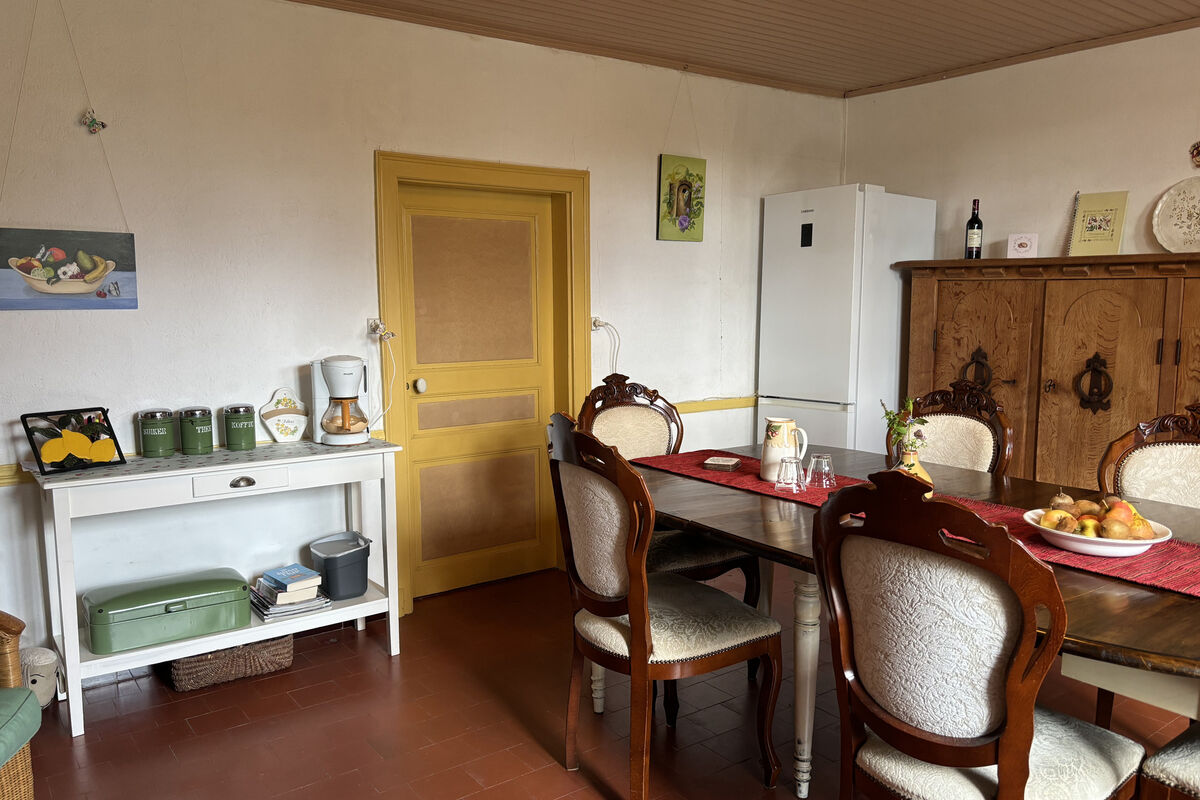 In het eerste gedeelte van de woonboerderij vindt u op de benedenverdieping een zitkamer met openslaande deuren naar het terras aan de voorzijde van het huis en een open haard. Aan de achterzijde van het huis is een aparte keuken die verwarmd kan worden door een houtkachel.