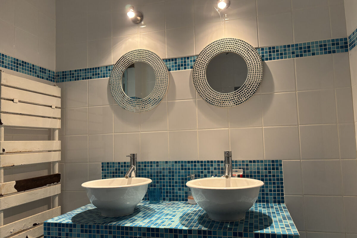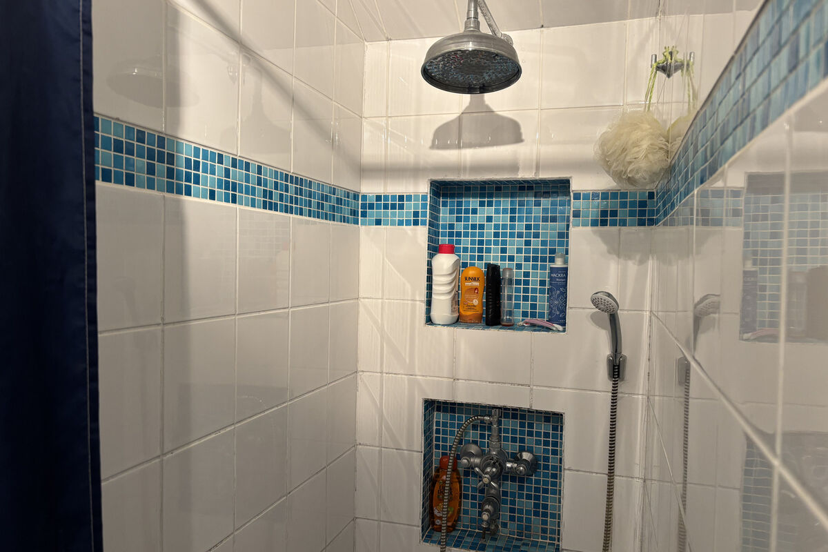 Rechts leidt een deur met een klein opstapje naar een halletje met een apart toilet en wastafel. Hier bevindt zich ook de afgesloten keuken, uitgerust met een 5-pits gasfornuis, oven en aansluiting voor een vaatwasser, de badkamer, keuken en wc zijn voorzien van vloerverwarming. Vanuit de keuken is er toegang tot de ruime badkamer met dubbele wastafel en open douche, evenals tot de eerste slaapkamer op de begane grond, voorzien van een raam met dubbele beglazing en een elektrisch rolluik.